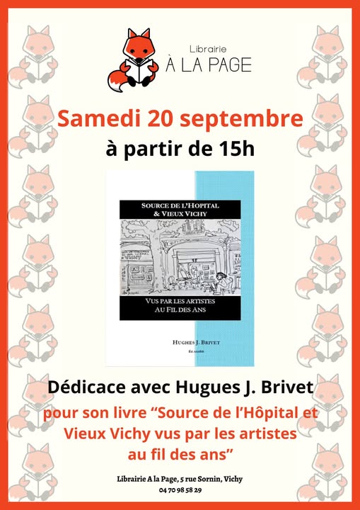 A l'occasion des Journées du Patrimoine, la librairie A LA PAGE (5-7, rue Sornin à Vichy, 03200) m'invite à dédicacer mon dernier ouvrage, Source de l'Hôpital et Vieux Vichy vus par les artistes au fil des ans, le 20 septembre 2025 de 15h à 19h.