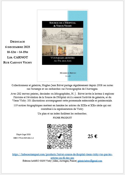 La LIBRAIRIE CARNOT (2-4, boulevard Carnot à Vichy, 03200) m'invite à dédicacer mon dernier ouvrage, Source de l'Hôpital et Vieux Vichy vus par les artistes au fil des ans, le 6 décembre 2025 de 10h à 12h & de 14h à 18h.