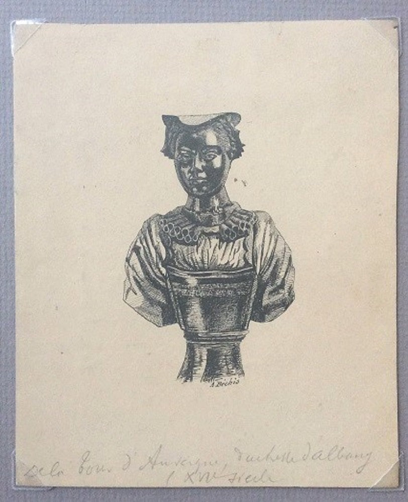 Dessin à la plume noire, signé « Ad. Béchis ». Annoté au crayon au recto en bas « De la Tour d’Auvergne, Duchesse d’Albany | XVe siècle », au verso du support (265*196 mm) « De la Tour d’Auvergne | (Duchesse d’Albany) Comtesse d’Auvergne | (sous François Ier) | Dessin à la plume » en dessous au crayon bleu « Unique ». Dim. : 133*110 mm, le sujet 80*50. Hist. : Fille de Jean IV d'Auvergne et de Jeanne de Vendôme, Anne de La Tour d'Auvergne (1495 † 1524), de Lauraguais, dame de La Tour, de Saint-Saturnin, de Montrodon marié le 8 juillet 1505 à son cousin Jean, duc d'Albany 2ème Stuart, duc d'Albany (1481 ou 1484 † château de Mirefleurs en Auvergne 2 juillet 1536). À sa mort, elle cède le comté d'Auvergne à sa nièce Catherine de Médicis (1519 † 1589) duchesse d'Urbino, fille de sa sœur Madeleine de la Tour d'Auvergne (ca 1497 † 1519) ayant épousé le 2 mai 1518 à Notre-Dame-de-Paris Laurent II de Médicis, duc de Toscane de 1492 à 1519. Étude d’après un buste en jais de 50 cm de haut et provenant de la Sainte chapelle de Vic-le-Comte pour une illustration dans la publication de Tardieu L’Auvergne Ancienne et Moderne de 1886 (annotation au crayon au verso). Provenance : Coll. Alfred Redon. Ancienne coll. Ambroise Tardieu (3 avril 1840 † 5 avril 1912).