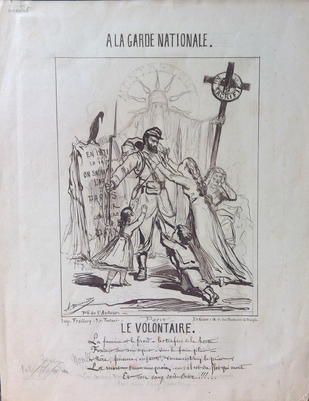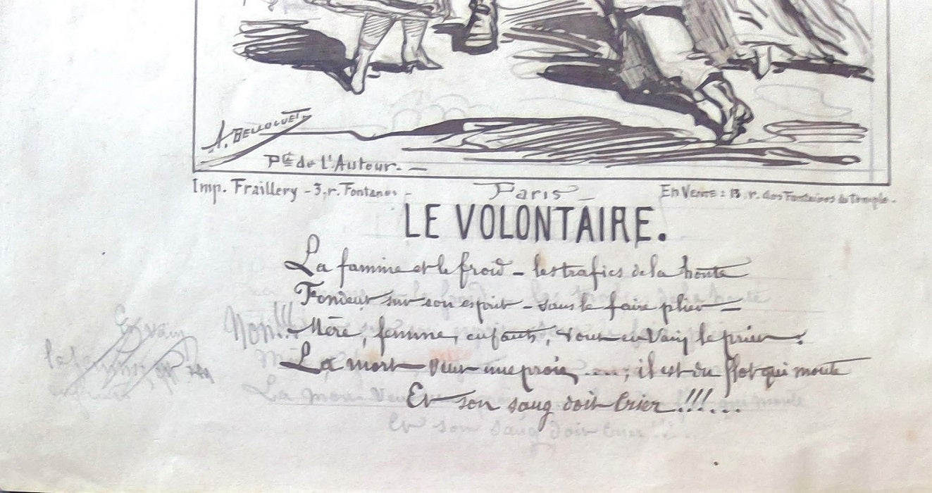 Dessin à l’encre et au crayon par André Belloguet ; étude pour une lithographie. Dans le cadre qui délimite le sujet, sbg A. Belloguet avec indication Pté de l’Auteur ; sous le cadre à gauche Imp. Fraillery – 3, r. Fontanus, à droite EN VENTE : 13, r. des Fontaines du Temple ; au centre Paris | LE VOLONTAIRE, en dessous légende écrite à l’encre noire reprenant un premier texte encore lisible au crayon La famine et le froid – les trafics de la honte | Fondent sur son esprit – sans le faire plier - | Mère, femme, enfants, tous en vain le prient. | La mort veut une proie… ; il est du flot qui monte | Et son sang doit Crier !!!... ». Une mention autographe au crayon en haut à gauche de la feuille nous indique que l’estampe serait « inédite ». Dim. : 323*250mm, le sujet 208*158 mm.