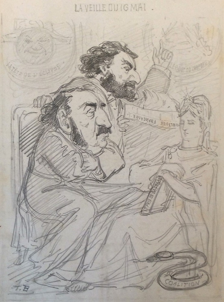 Dessin par André Belloguet, la feuille 300*210 mm, le sujet 250*187 mm. Projet d'illustration pour le journal L'Éclipse. Crise de la Troisième République, Mac-Mahon, Léon Gambetta. En savoir plus.