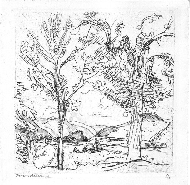 Gravure originale à la pointe-sèche tirée au recto d'un MENU représentant une scène champêtre animée de quatre personnages au centre, au premier plan deux arbres, en arrière-plan des collines sous un ciel. La feuille h. 190*380 mm pliée en deux soit quatre pages : page une ou couverture (190*190 mm) comportant la gravure (au TC 162*160, au CP 170*168). Signée à la pointe dans la planche en bas à droite. Sous le Trait Carré à gauche signature au crayon « Jacques Beltrand » à droite justificatif du tirage (1/16) ; la page trois comportant le menu du « DEJEUNER du PRIX de la GRAVURE Jeudi 10 Mars 1938 » au restaurant Drouant, Place Gaillon, Paris. Jacques Beltrand (Paris, 22 juillet 1874 † Coucy-les-Eppes, 8 décembre 1977) avait déjà réalisé un bois pour le Dîner du jeudi 15 décembre 1927. TBE malgré déchirure au bas de la pliure centrale (2 cm). Bibl. : IFF1800, p.163, n°77.