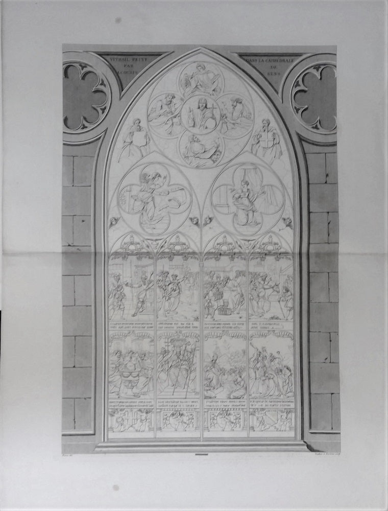 Planche (ef) dressée par Jacques Martin Sylvestre Bence (1770 † 18..) gravée par Vuthier et F. Lorieux pour les Monuments de France, tome II, Imp. de F. Didot l'Aîne, 1836. En haut dans une rosace entourée d'un cercle le Christ entouré des quatre évangélistes St Jean, St Pierre, St Luc et St Marc ; de part et d'autre du cercle deux figures de Moïse teant à g un écu vide à d un autre écu avec les armoiries dele blason. En dessous dans deux rosaces cerclées et séparées par quatre angelots l'Annonciation à la Vierge Marie. En bas huit scènes de la vie de St Eutrope. Jean Cousin le vieux (Soucy (près de Sens), 1490/1500 † Paris, >1560). Grande planche avec sa pliure médiane horizontale d'origine. Petites déchirures sur les bords. Dim. : 765*575 mm.
