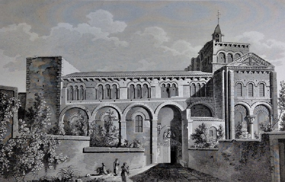 Estampe dessinée par Bence, gravé par Jean-Baptiste Réville (Paris, 1767 † 1825) et F. Lorieux. Planche (ef) pour les Monuments de France, tome II, Imp. de F. Didot l'Aîne, 1836. Paysage animé avec trois femmes dont une tient un enfant dans ses bras. Dim. : 395*555 mm le sujet 285*445 mm.