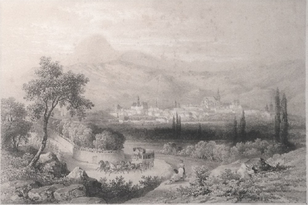 Lithographie par Alphonse Bichebois (1801 † 1850) d'après Silvant tirée par Hubler et Dubos à Clermont-Fd, publiée chez Ducher et Laussedat. Paysage animé avec au premier plan des personnages et une malle poste, en arrière-plan à gauche le puy de Dôme, à droite les clochers de la ville dont la cathédrale sans ses flèches. La feuille 308*415 mm, le sujet 200*301 mm.