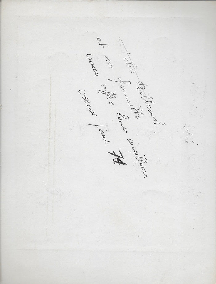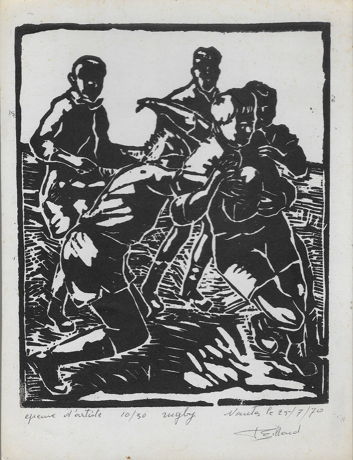 Estampe/Bois original du peintre nantais Félix Billard (1912 † 1988). Sous le Trait Carré à l'encre noire annotation autographe, « épreuve d'artiste 10/30 rugby Nantes le 25/7/1970 | Billard ». Envoi au dos adressé au couple vichyssois Régine et Jean Desbordes « Félix Billard | et sa famille | vous offre leurs meilleurs | vœux pour 1971 ». La feuille 210*160 mm, au TC 174*140 mm L'atelier de Félix Billard, 1912-1988 a été vendu à Nantes, Hôtel des ventes de Rhuys, le 17 novembre 1990 par Me François Antonietti.