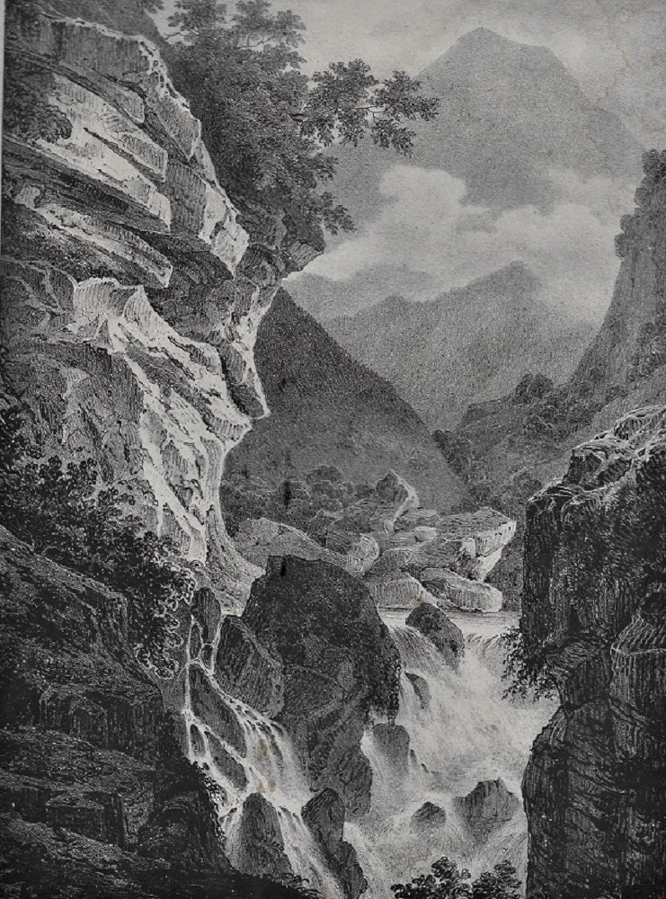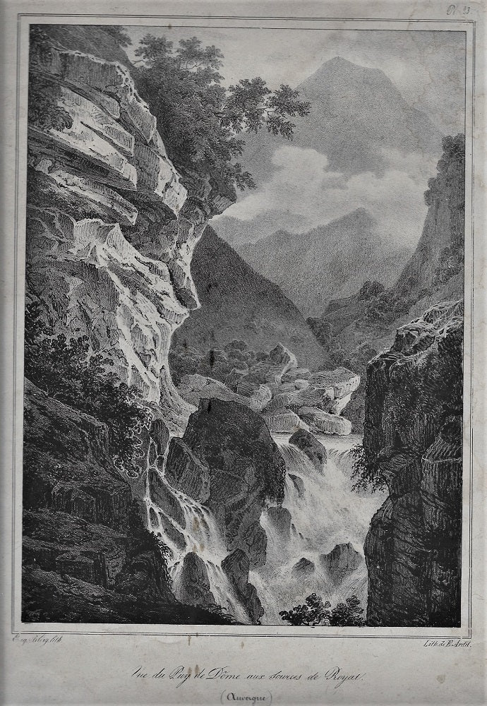 Lithographie par Eugène Stanislas Alexandre Bléry (1805 † 1886) sur Chine (300*211 mm) appliqué sur vélin (307*235 mm). Bléry produisit quelques planches gravées ou lithographiées sur l’Auvergne (Cantal et Puy-de-Dôme). Le peintre Eugène Buttura (1812 † 1852) réalisa un portrait du graveur Bléry interprété par l’élève de ce dernier, Charles Meryon (1821 † 1868). Provenance : Coll. Alfred Redon. Bibl. : Bdf, 23 janvier 1830, n°43 ; IFF1800, vol. 2, p. 503.