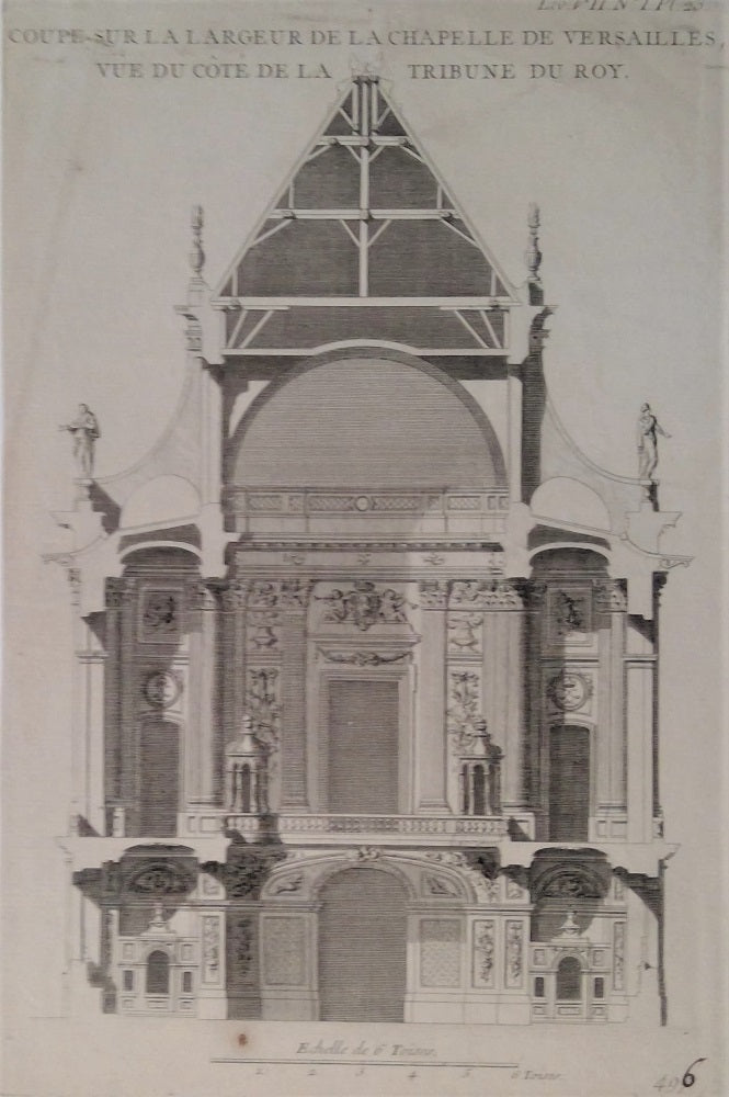 Coupe sur la largeur de la Chapelle de Versailles vue du côté de la Tribune du Roy (1756). Figure dressée par Jacques-François Blondel (Rouen, 8 janvier 1705 † Paris, 9 janvier 1774 ) découpée ; en haut le titre au dessus à droite Liv VII N°1 Pl 23 ; en bas à droite de l'échelle le chiffre imprimé 497 avec le 7 remplacé à l'encre par 6. Dim. : 282*188 mm