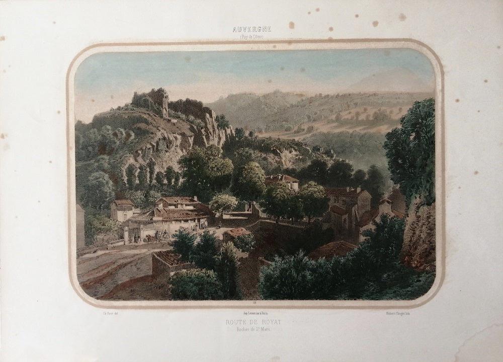 Estampe dessinée par Charles Bour (Lunéville, 1814 † 1881), lithographie couleur par Hubert Clerget (Dijon, 28 juillet 1818 † St-Denis, 4 mars 1899), tirée par Lemercier. Le rocher est en réalité celui de St Mart qui, né à Royat vers 440, se retira dans la vallée. Tâche d’humidité dans le coin inférieur droit. La feuille 313*433 cm, le sujet 21*30 cm.