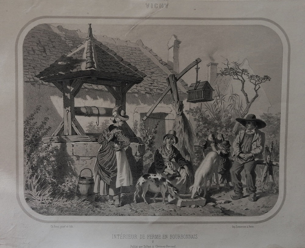 Estampe sur chine collé (252*315 mm) par Charles Bour (Lunéville, 14 décembre 1814 † 8 octobre 1881), lithographie tirée par Lemercier pour Talbot à Clermont-Ferrand. Scène de genre pittoresque avec devant un puit quatre personnages (2 femmes dont une portant le chapeau à deux bonjours, un enfant, un homme) et deux cochons. Déchirure dans la marge supérieure avec légère atteinte au sujet dans le ciel au-dessus de la toiture. Le sujet 195*260 mm.