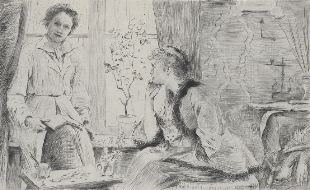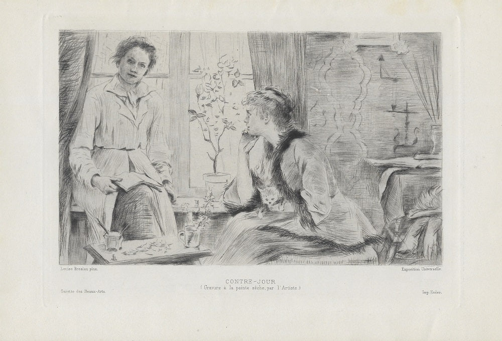 Pointe sèche originale de Louise Breslau d’après son tableau (1888) pour La Gazette des Beaux-arts de septembre 1889. Sous le TC, à g. Louise Breslau pinx, à d Exposition universelle, en dessous Gravure à la pointe sèche par l'artiste, en bas Gazette des beaux-arts et Imp. Eudes. Bibl. : La Gazette des Beaux-arts demande à Louise Breslau une pointe sèche originale afin d'illustrer le premier article de Maurice Hamel (1856 † 1949) sur l'Exposition Universelle de 1889, « Les écoles étrangères » (pp. 225-256) ; l'illustration du deuxième article étant confiée au graveur bourbonnais Marcellin Desboutin (Cérilly (Allier), 26 août 1823 † Nice, 18 février 1902) avec une pointe sèche d'après le peintre hollandais Jozeph Israëls (1824 † 1911). Dans cette estampe, gravée, Louise Breslau s’est représentée, appuyée contre le rebord de la fenêtre près duquel est accoudée son amie, l’écrivain et peintre Madeleine Zillhardt (1863 † 1950), à gauche. La feuille h. 188*273 mm, au TC 125*205 mm, au CP 155*225 mm.