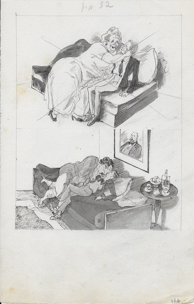Dessin, encre et crayon, par Zygmunt Leopold Brunner dit ZYG BRUNNER (Varsovie (Pologne), 12 novembre 1878 † Paris, 7 avril 1961) précédé de son esquisse au crayon sur une même feuille (25,9*16,7 cm). Illustrations représentant une femme corpulente d’un certain âge bloquant un adolescent, le dessin, plus érotique, montre la dame, le sein dénudé, glissant sa main entre les jambes croisées du jeune homme sous le regard d’un portrait d’homme accroché au mur; à droite sur un guéridon deux tasses, une carafe, un paquet de cigarette, des fruits. Au dessus du trait délimitant les dessins page 32. Dim. dessin 18*14 cm