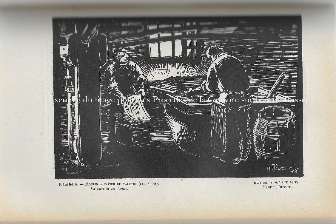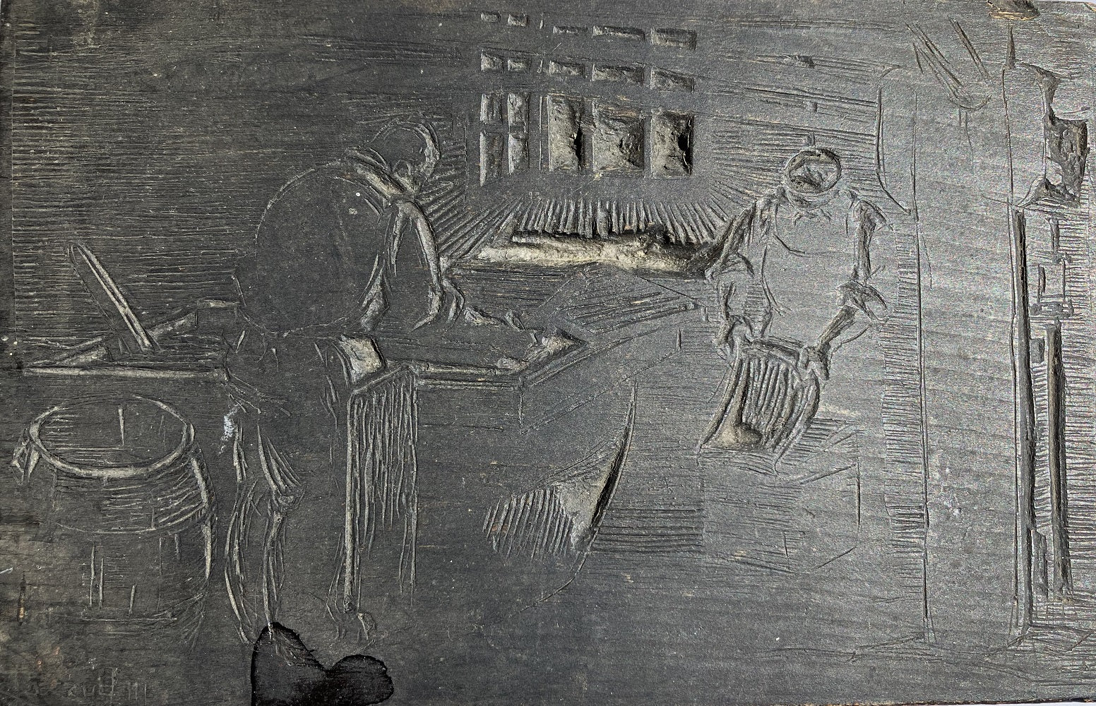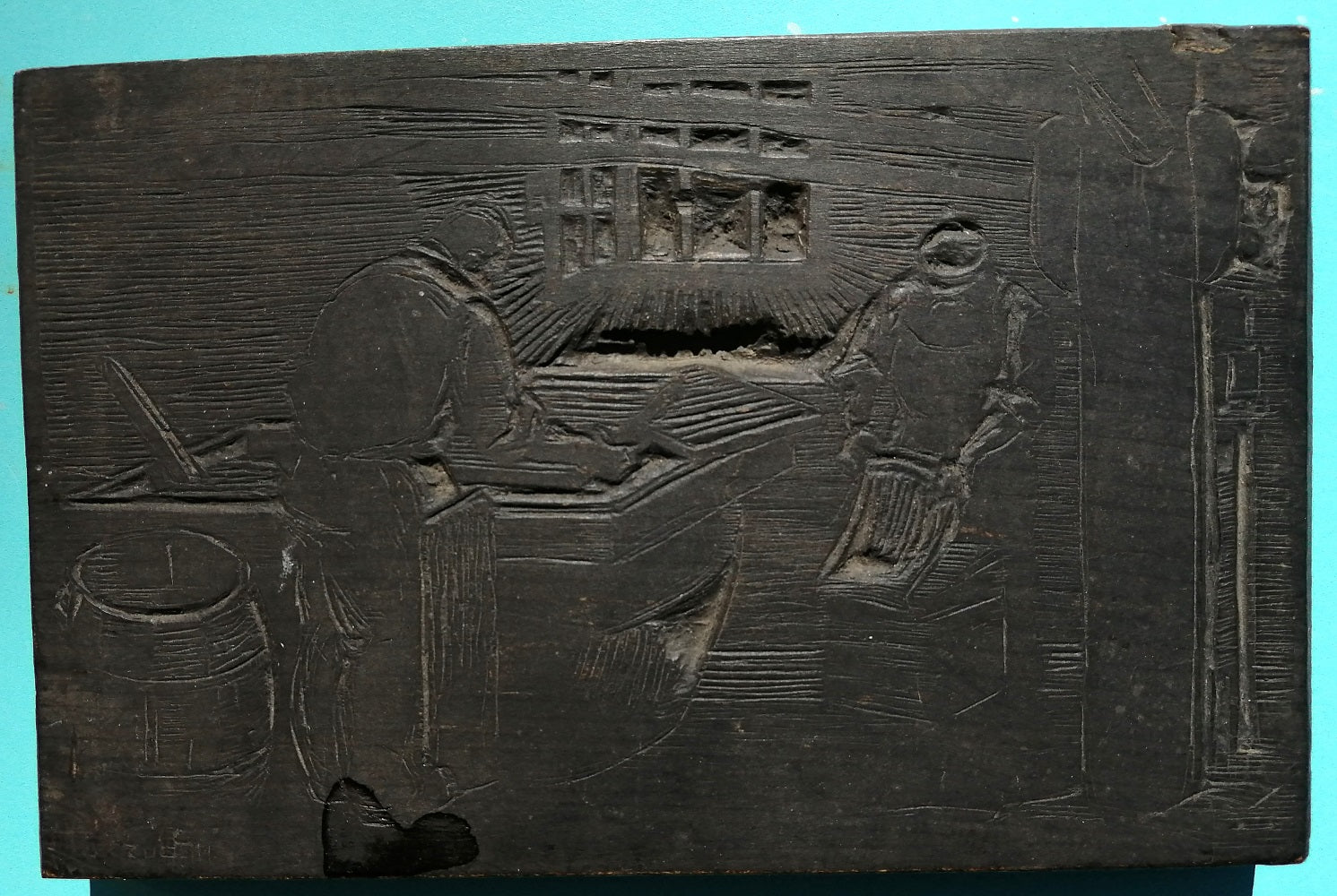 Matrice en hêtre gravée au canif par Maurice Busset, SDbg (date illisible 192*), 138*212*20 mm. Un tirage illustre l'ouvrage de Busset La Technique moderne du bois gravé, Planche n°6. A TITRE D'EXEMPLE, copie de la planche.