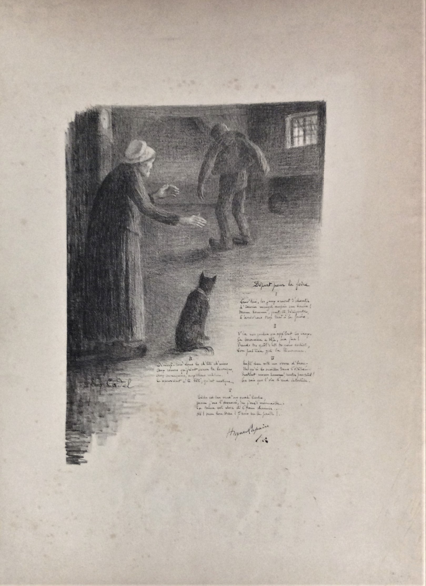 Estampe/Lithographie. Illustration du peintre, graveur et critique d’art Eugène-Casimir Cadel (Paris, 18 juin 1862 † Paris, 27 septembre 1941) pour un poème du poète berrichon Hugues Lapaire (Sancoins (Cher), 26 août 1869 † Sancoins, 2 janvier 1967). Signée dans la planche au bas du sujet. Dim. : 647*475 mm, le sujet texte compris 393*278 mm. Romancier régionaliste, Lapaire développe dans ses écrits les valeurs rurales du Berry, Bourbonnais (il fit ses études à Moulins dans l’Allier), et Nivernais (ami d’Achille Millien). Belles marges. Épidermures.