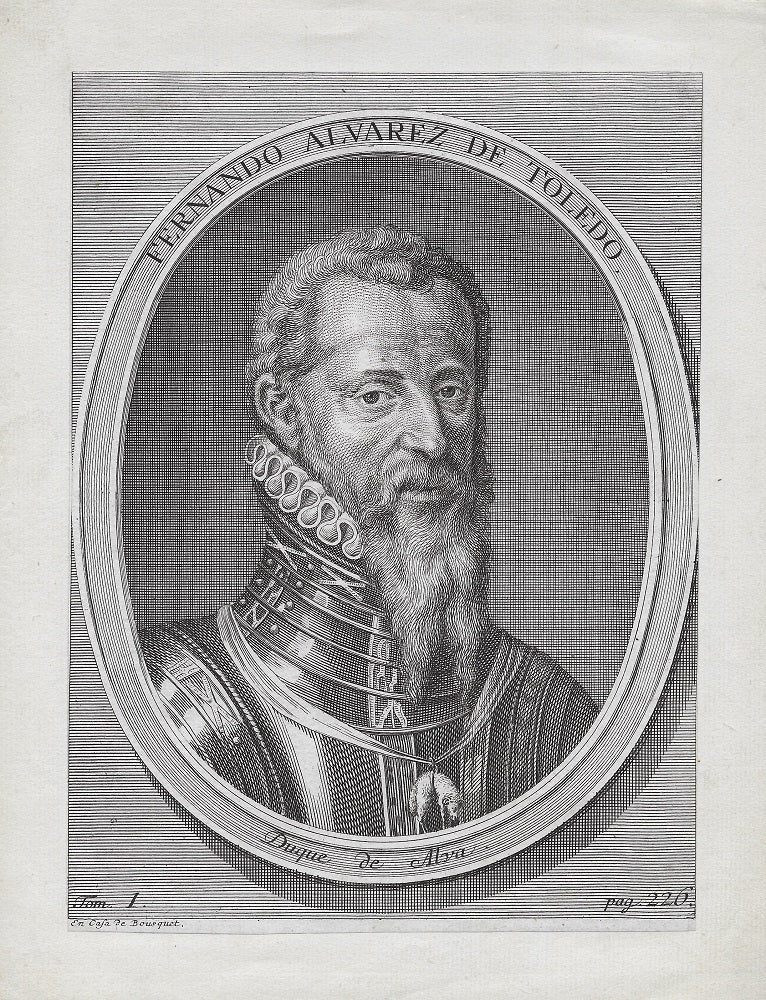 Estampe/Gravure et eau-forte. Portrait de Fernando Álvarez de Toledo y Pimentel (Piedrahíta (Espagne), 29 octobre 1507 † Lisbonne (Portugal), 11 décembre 1582), 3ème Duc d’Alba, le buste tourné vers la droite, regardant le spectateur, avec une longue barbe en pointe, portant une fraise, armure et les insignes de l'Ordre de la Toison d'Or ; inscriptions dans un ovale. Portrait probablement gravé pour une histoire de Flandres de l'historien et jésuite le père Famiano Strada (1572 † 1649) publiée à Anvers en 1639). Sous le sujet Tom. 1 et pag. 226, en-dessous à gauche En Casa de Bousquet.