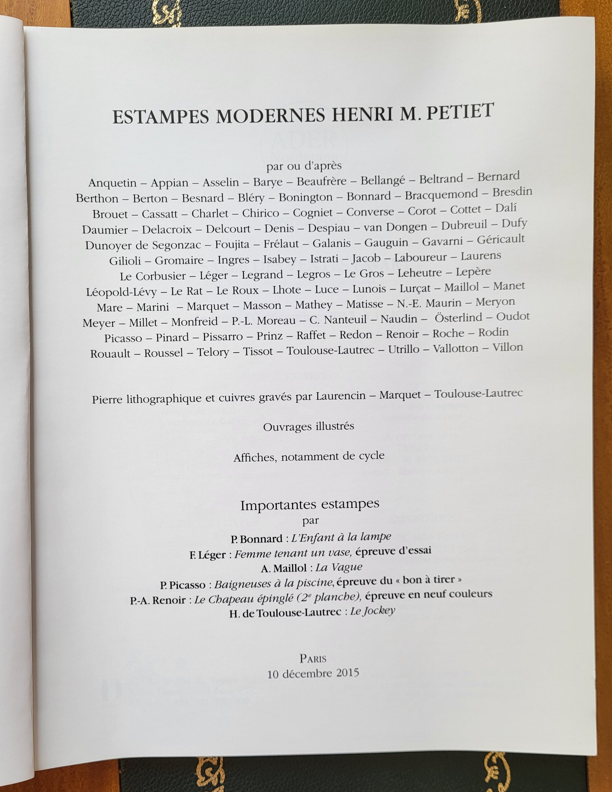 Catalogue Exposition vente aux enchère de la Collection Henri Petiet du 10 décembre 2015 par la Société ADER. 324 œuvres commentées et parfois reproduites. Estimations sur feuillet séparé. 171 p. Broché, 255*200 mm.