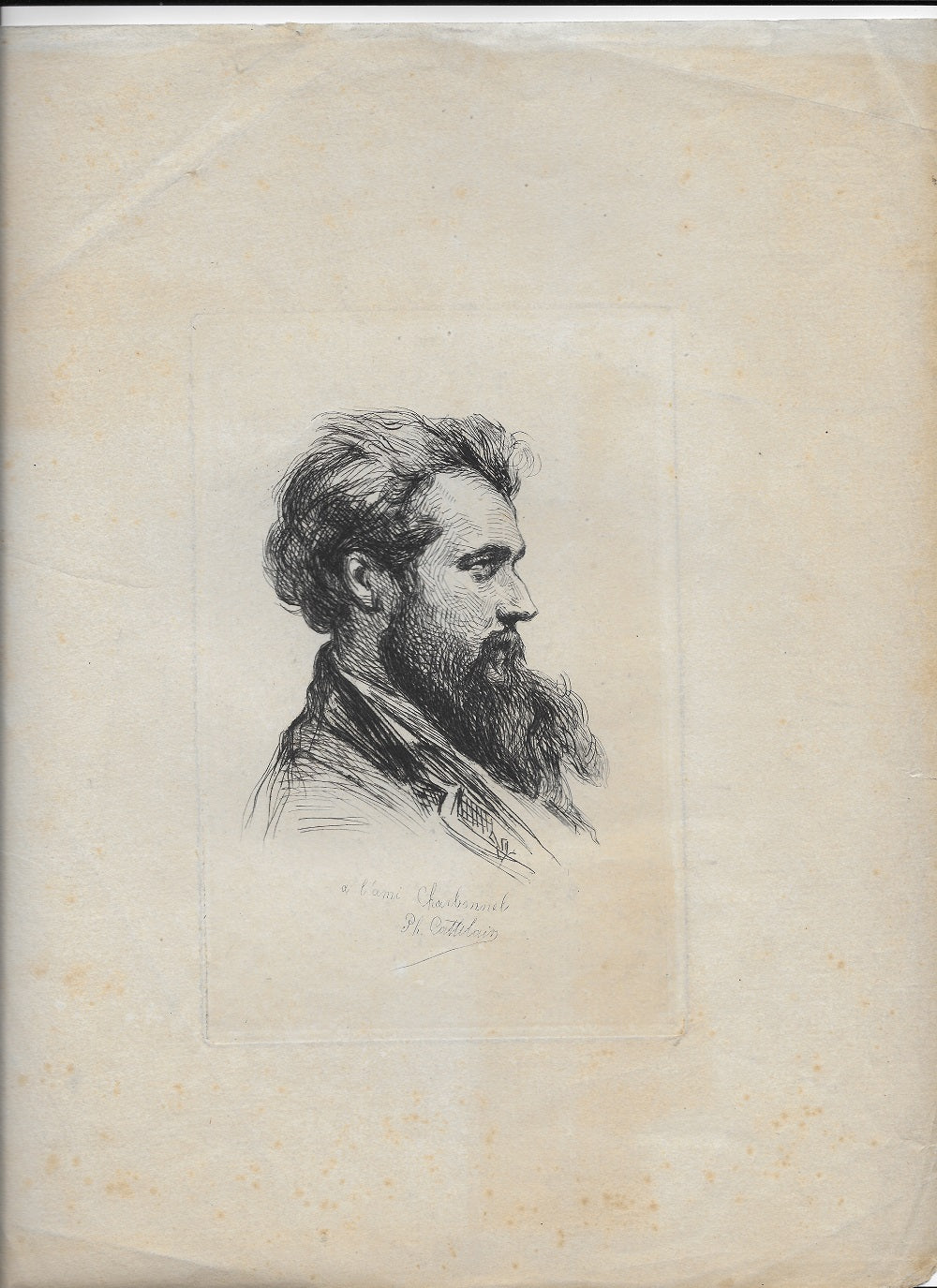 Portrait du peintre et graveur cantalien Jean-Louis Charbonnel (Paulhac, 28 mars 1848 † Paris, 22 mai 1885) gravé à l'eau-forte en 1887 par Philippe Auguste Cattelain (1838 † 1893) La feuille 295*240 mm, au CP 170*110 mm ; sous le sujet, dans la cuvette, dédicacée à la pointe à l'ami Charbonnel | Ph. Cattelain .