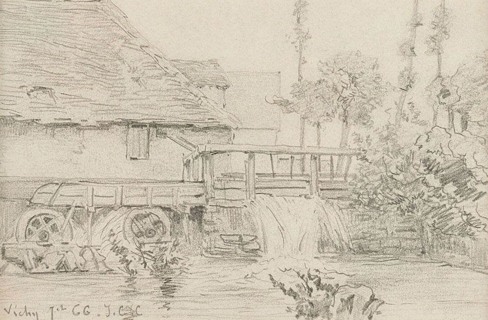 Dessin au crayon noir par le peintre de la Côte d'Opale et graveur Jean-Charles Cazin (Samer (Pas-de-Calais), 25 mai 1841 † Lavandou (Var), 26 mars 1901). Situé et daté Jet 66 et monogrammé en bg. Vue d'un moulin sur le Sichon entre Vichy et Cusset (Allier). 115*170 mm.