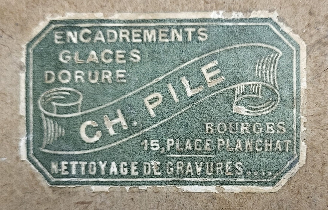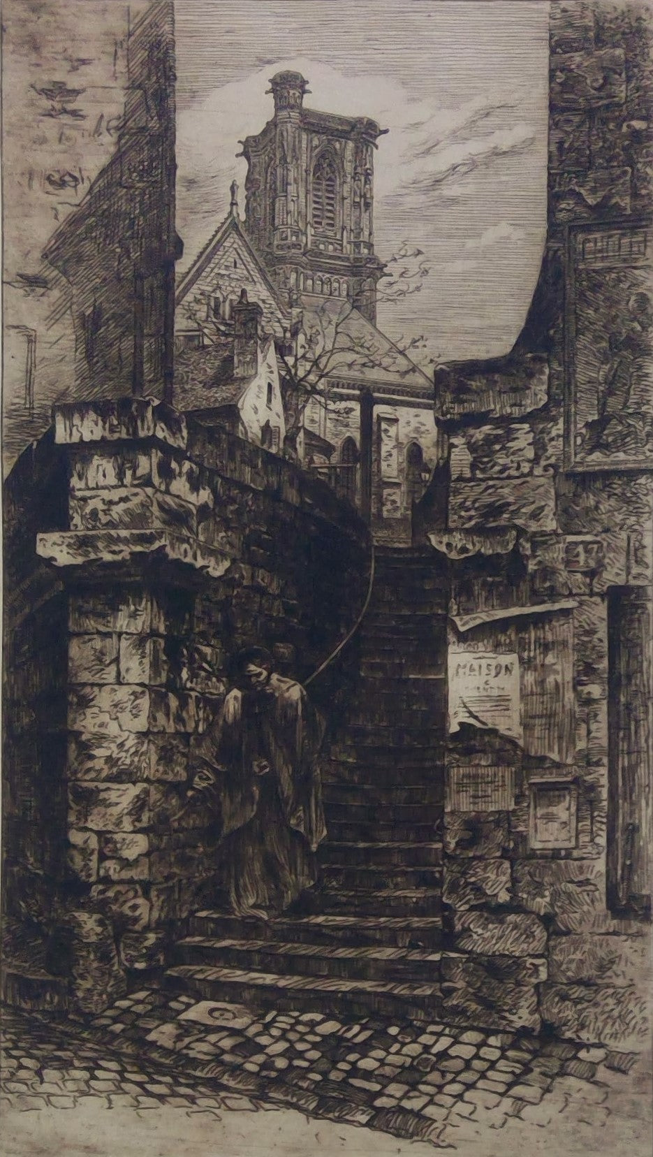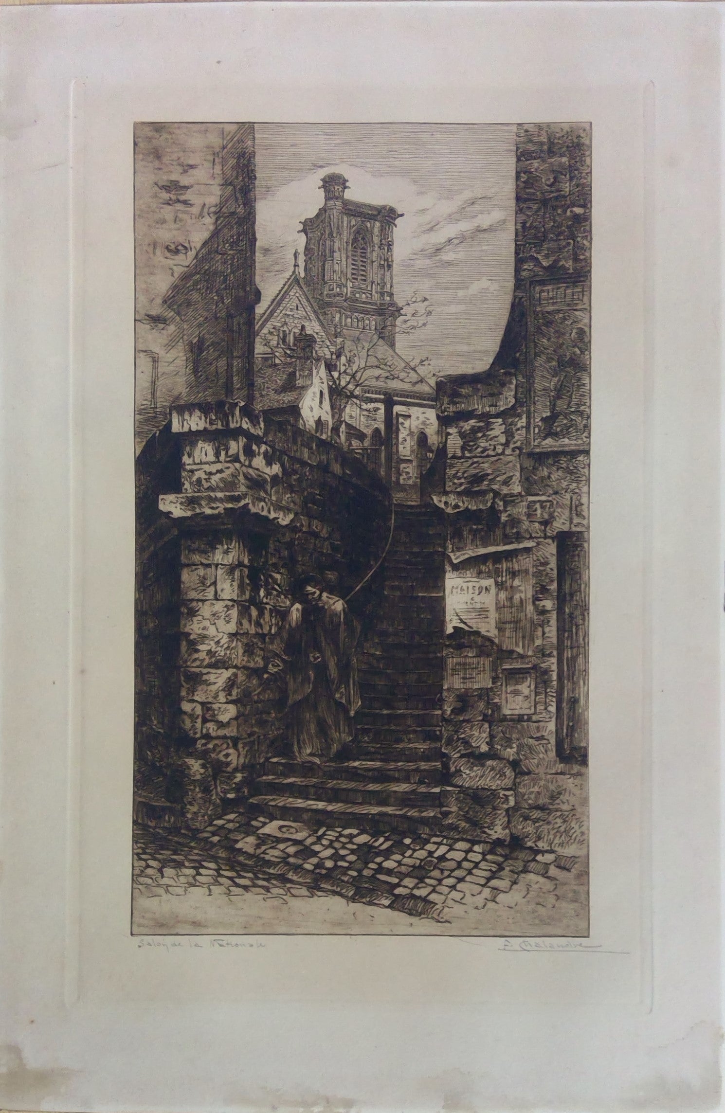 Eau-forte originale sur papier vélin par le graveur nivernais Fernand Chalandre (1879 † 1924). Sous le TC au crayon à g « Salon de la Nationale » à d « F. Chalandre ». Au dos annotée au crayon « Nevers Escalier des Jacobins ». 1ère eau-forte originale de FC exposée à la Salon de La Société Nationale des Beaux-arts, n° (cf. Lefébure, La Nièvre gravée, p.24). Dim. : la feuille 507*323 , au TC 352*198 mm, au CP 402*256 mm. Salissures dans les marges. Au dos du carton d'encadrement étiquette verte de l'encadreur Ch. Pile à Bourges (15, Place Planchat).