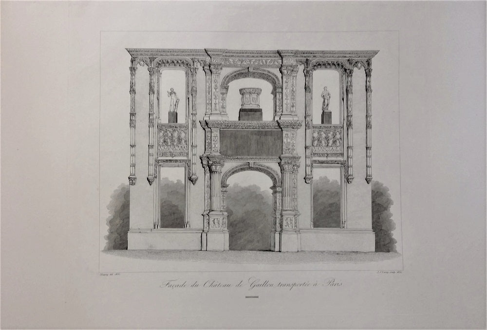 Grande planche dessinée par Nicolas Marie Joseph Chapuy (1790 † 1858) en 1835 et gravée par l'aquafortiste Jean Jacques Leroy (Paris, 1797 † ?) en 1836 pour Les Monuments de la France d'Alexandre de Laborde, tome II pl. 234. Leroy expose au Salon de 1841 une Vue du Portique de Gaillon, Premier château de style Renaissance construit en France (1500-1509) situé en Normandie transformé en centre pénitentiaire par l'administration de Napoléon Ier. Dim. : la feuille 405*575 mm, le sujet 280*345 mm. Belles marges.