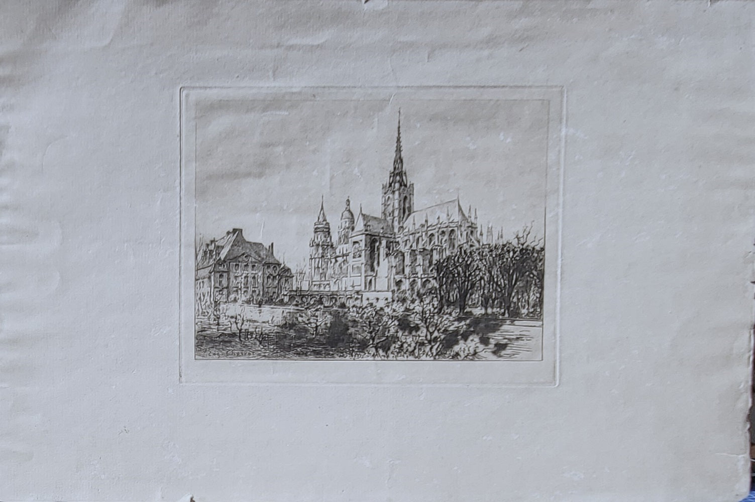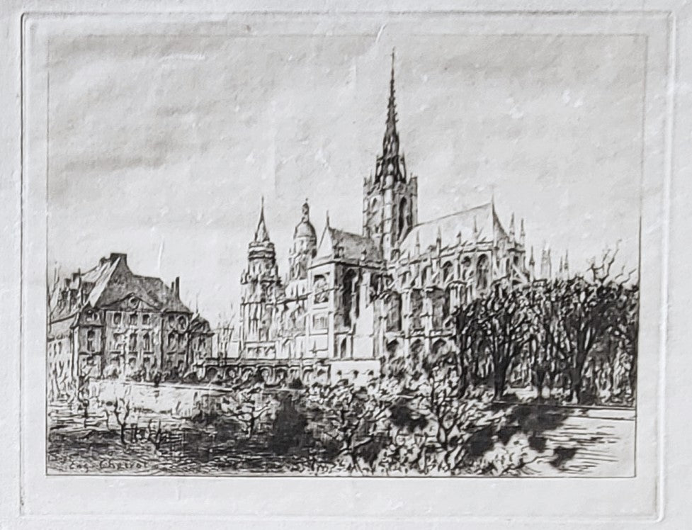 Eau-forte originale du médecin peintre et graveur Eugène Louis Charvot (Moulins, 11 février 1847 † Paris, 8 février 1924). planche de la suite de sept eaux fortes originales Évreux éditée par Georges Lebigre en 1906, tirée sur Vergé épais, 412*290 mm, au TC 139*191, au CP 160*208, signée et datée à la pointe dans la planche en bas à gauche Eug. Charvot 05. Belles marges.