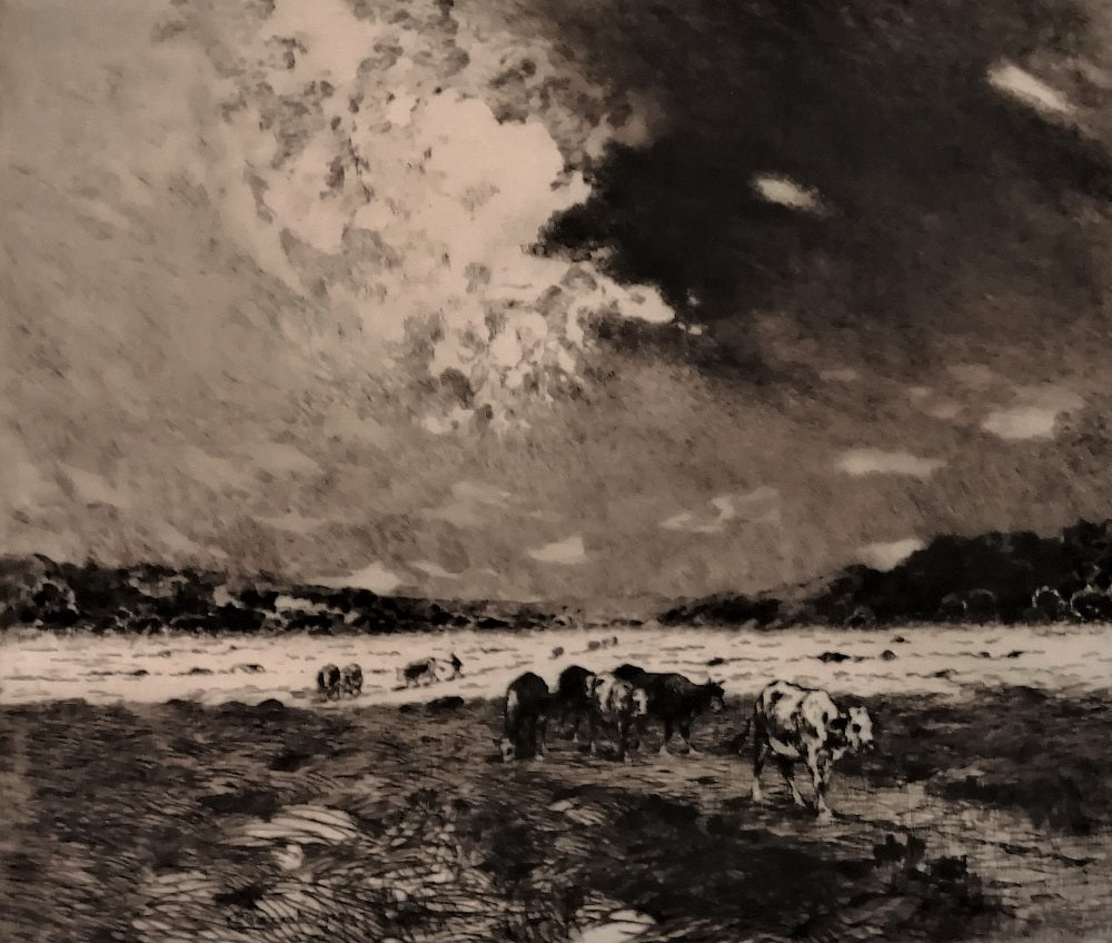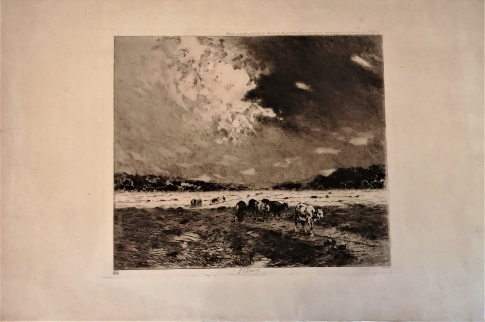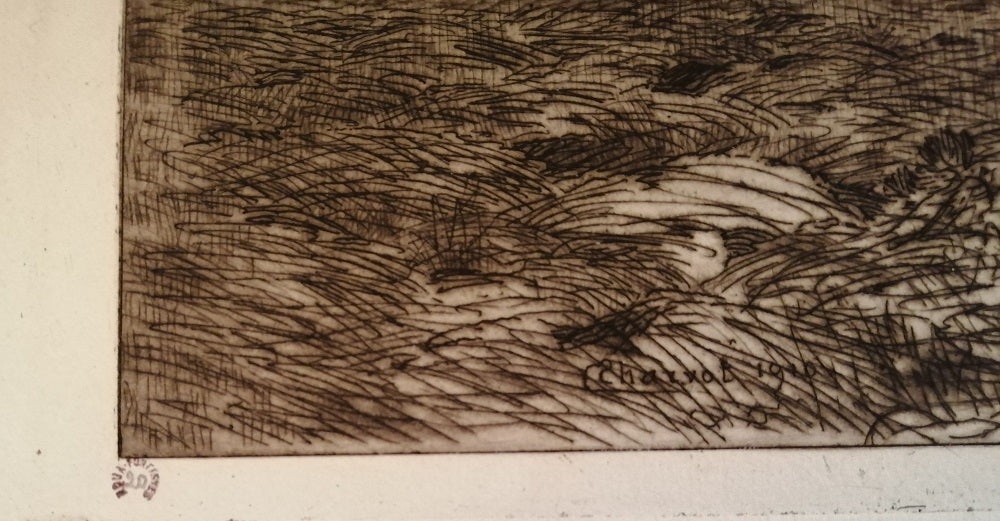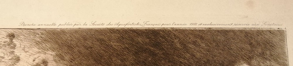 Eau-forte du médecin peintre et graveur Eugène Louis Charvot (Moulins, 11 février 1847 † Paris, 8 février 1924). SDbg dans la planche E Charvot 1912, Annotée au dessus du TC à d Planche annuelle publié par la Société des Aquafortistes français pour l'année 1912 et exclusivement réservé aux sociétaires, sous le trait carré en bg timbre estampé rond à l’encre noire AQUA-FORTISTES avec au crayon le numéro de l’épreuve 20 (Lugt L. 18), au milieu contre signé à la pointe Dr E Charvot, en bd Imp L. Fort. Charvot était le président de l’Association pour cette année là. Déchirure bord marge gauche 2 cm environ. La feuille 362*555 mm, au TC 255*300 mm.