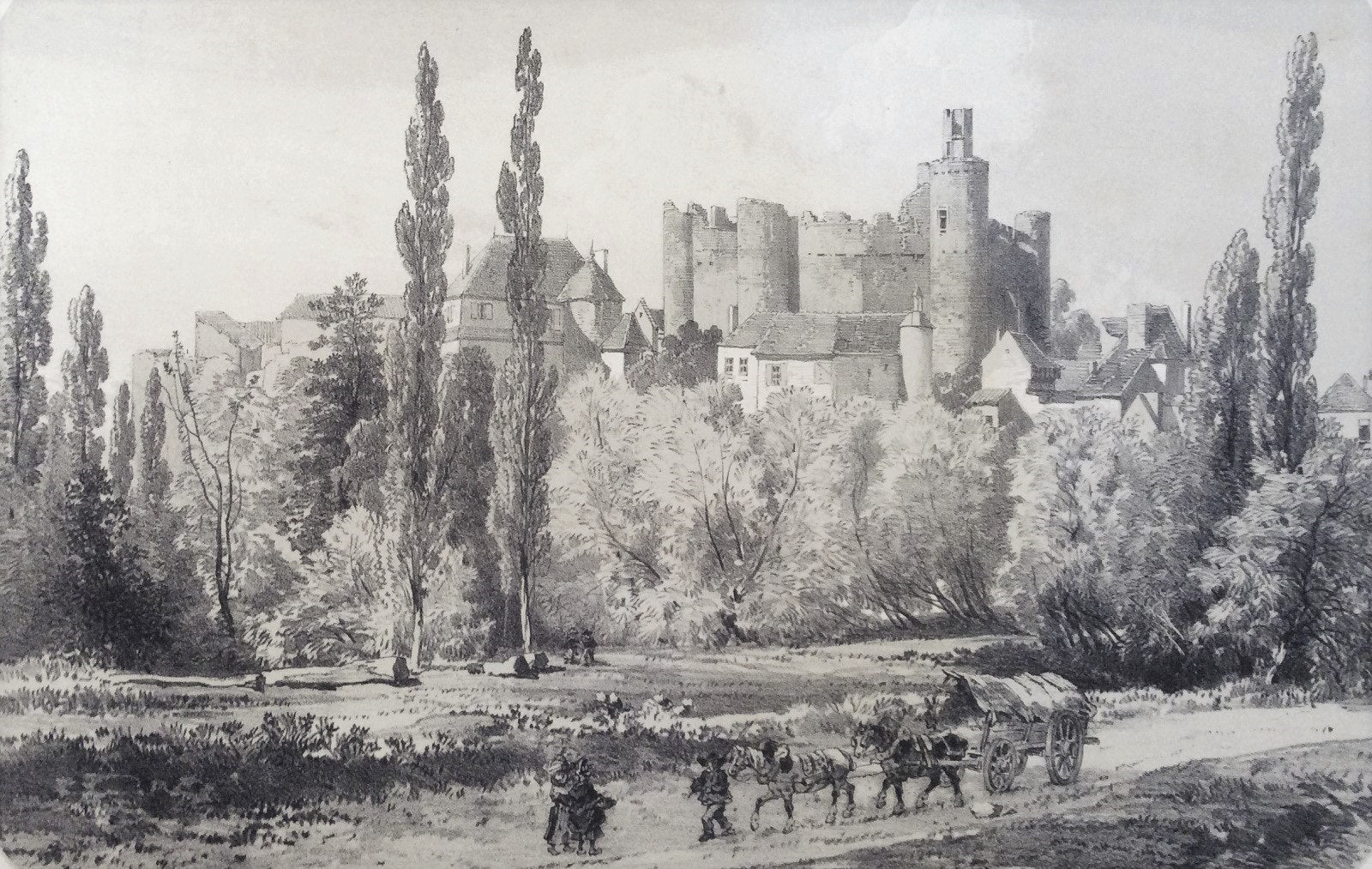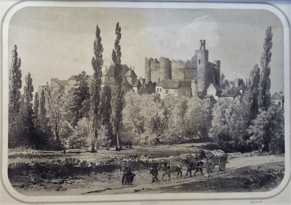 Estampe/Lithographie par Etienne Eugène Cicéri (Paris, 27 janvier 1813 † Marlotte (Seine-et-Marne), 20 avril 1890) dessinée par Charles Bour (Lunéville, 14 décembre 1814 † 8 octobre 1881), Impr. Lemercier, Paris. Vue animée avec au premier plan, deux femmes croisant un paysan avec sa charrette tirée par deux chevaux, en arrière-plan les ruines du château avec au pied les maisons du bourg. Bibl. : Bdf du 31 mai 1851, n°453. La passe partout 375*550 mm, le sujet 208*309 mm.