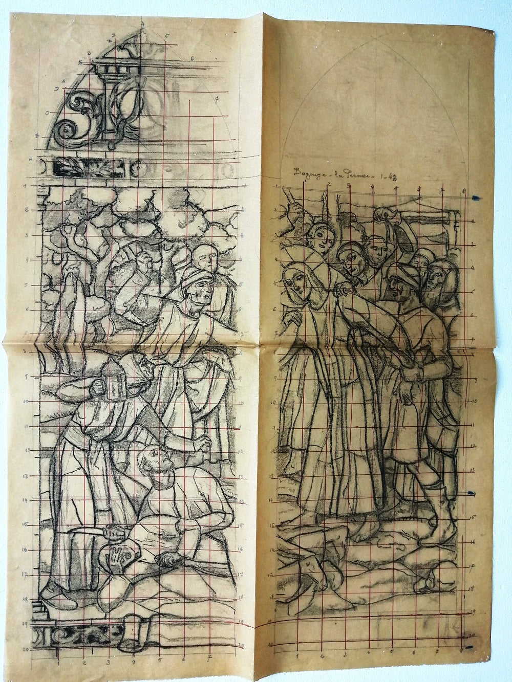 Projet de vitrail dessiné par l’Atelier Georges Louis Claude (Paris, 15 juin 1879 † Montmorency (Val d'Oise), 26 avril 1963) pour l'église de Bazouges-la-Pérouse (Ille-et-Vilaine, Bretagne). Deux dessins (g. 522*164 mm, d 390*161 mm) mis au carreau au crayon et à l'encre rouge sur feuille calque (555*410 mm) Annoté au crayon au-dessus du dessin de droite Bazouges-la-Pérouse 1-43. Au dos étiquette ovale d'atelier avec le chiffre 261. Deux pliures (horizontale & verticale). La paire de vitraux est située au dessus de celle reprenant un épisode de la Genèse.