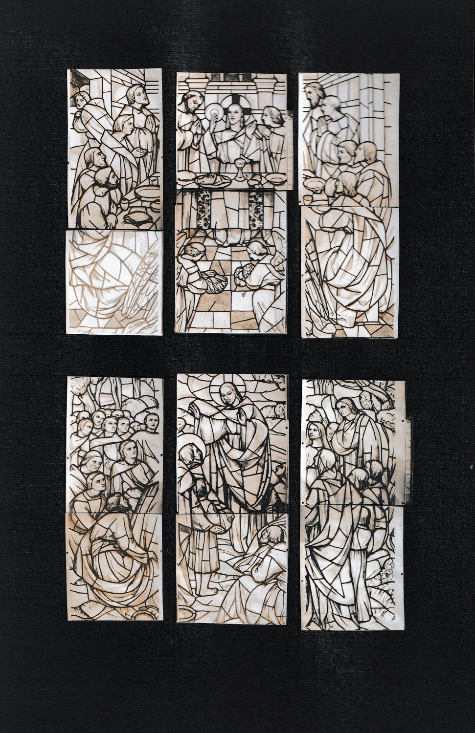 Deux montages de photographies par l'Atelier Georges Louis Claude (Paris, 15 juin 1879 + Montmorency (Val d'Oise), 26 avril 1963), décorateur à Levallois Perret des vitraux : LA CENE & LE SERMON SUR LA MONTAGNE. Collées sur carton ( 290*190 mm) Cachet G L Claude au dos.