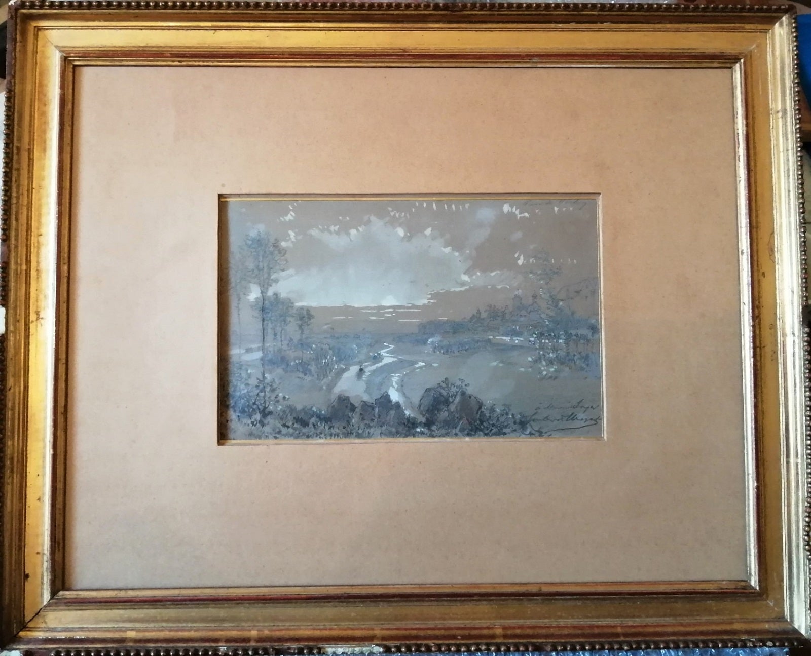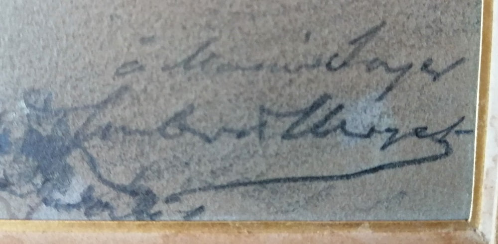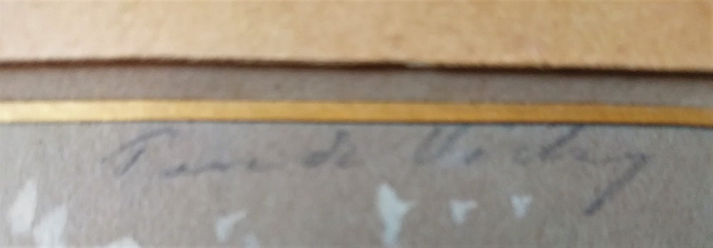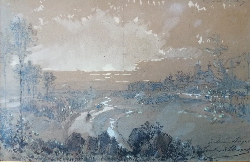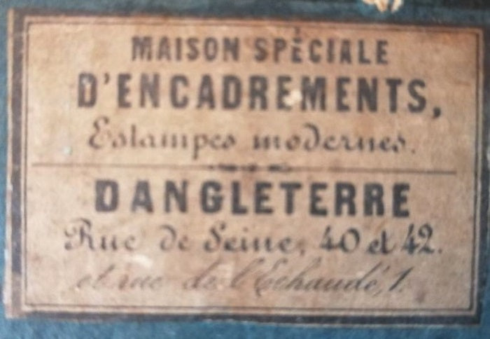 Dessin par Hubert-Clerget (Dijon, 28 juillet 1818 † St-Denis, 4 mars 1899), mine de plomb et lavis, signé en bd avec envoi à Monsieur [S]oyer | Hubert Clerget, titré en hd Parc de Vichy. La feuille 210*315 mm, sous passe-partout 347*445 mm, la vue 155*248 mm, encadrement 415*510 mm. Vue de la vieille ville de Vichy prise en amont de l’Allier avec à droite les ruines du couvent des Célestins surplombant les nouveaux bâtiments de la Source des Célestins (Salle et kiosque/buvette), le clocher de l’église Saint-Blaise, la Tour de France, le Castel-Franc, les bords de l’Allier, le pont reliant Vesse (aujourd’hui Bellerive-sur-Allier) à Vichy. Le paysage est animé par deux groupes personnages soulignés par une pointe de couleurs, l’un au milieu de la rivière asséchée, l’autre sur le parc face à la Source des Célestins. Au verso, étiquette de l’encadreur MAISON SPÉCIALISÉE | D’ENCADREMENTS. | Estampes modernes. | DANGLETERRE | Rue de Seine, 40 et 42 | et rue de l’Échaudé, 1.