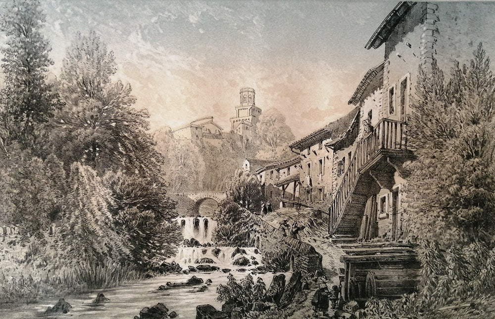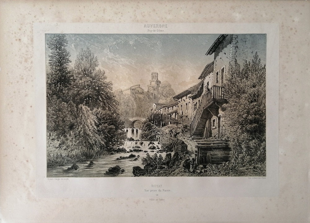 Lithographie couleur par Hubert Clerget (Dijon, 28 juillet 1818 † St-Denis, 4 mars 1899), tirée par Lemercier pour Talbot (n°13). Epidermures et insolation dans les marges. Paysage romantique avec au premier plan la Tiretaine, sur la rive droite un moulin à eau, sur le chemin cinq groupes de paysans devant les habitations rustiques. Dans l'arrière plan, l'église de Royat. La feuille 31*43 cm, le sujet 195*300 mm.