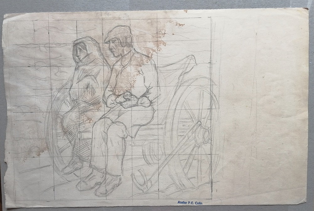 Dessin au crayon par le médecin peintre lorrain Paul-Émile Colin (Lunéville (Meurthe-et-Moselle), 16 août 1867 † Bourg-en-Bresse (Ain), 28 octobre 1949) représentant un couple de paysans dans le froid se reposant, assis à l’arrière d’une charrette. Dessin mis au carreau (pour une éventuelle gravure ? que nous n’avons pas identifiée). Sous le sujet à droite cachet à l’encre Atelier P. E. Colin (L.3734). Tâche d’humidité dans le tiers supérieur gauche du dessin. Provenance : Acquisition lors de la vente du 4 février1993 (Paris, Drouot-Richelieu, étude H.-P. Cheval et M.-F. Robert, expert cabinet Camard). La feuille 382*247 mm, le sujet 227*250 mm.