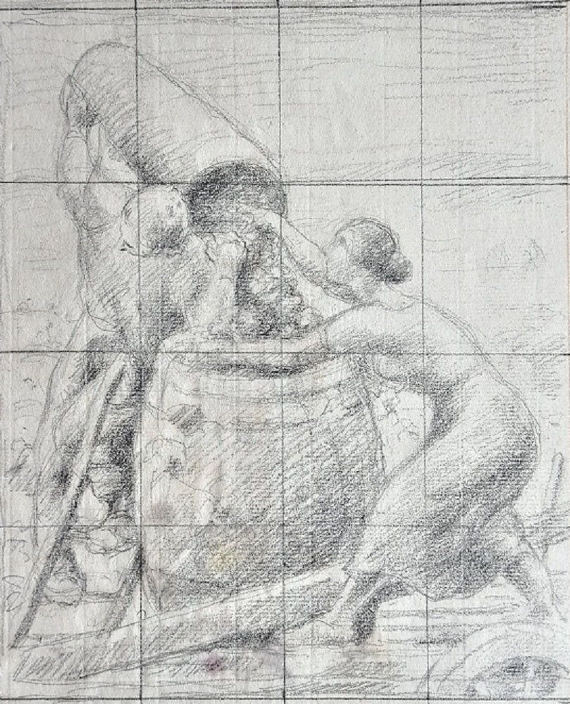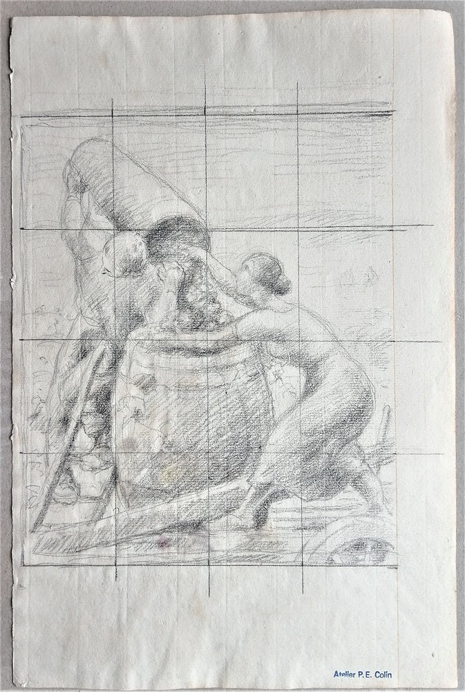 Dessin au crayon sur vergé par le médecin peintre lorrain Paul-Émile Colin (Lunéville (Meurthe-et-Moselle), 16 août 1867 † Bourg-en-Bresse (Ain), 28 octobre 1949) représentant un paysan versant les raisins de sa hotte dans un tonneau aidé par une femme. Dessin mis au carreau (pour une éventuelle gravure ? que nous n’avons pas identifiée). Au bas de la feuille à droite cachet à l’encre Atelier P. E. Colin (L.3734). Provenance : Acquisition lors de la vente du 4 février1993 (Paris, Drouot-Richelieu, étude H.-P. Cheval et M.-F. Robert, expert cabinet Camard). La feuille 365*240 mm, le sujet 245*202 mm.