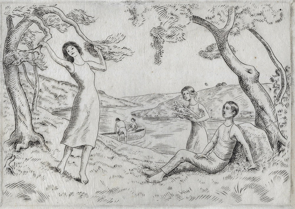 Estampe originale sur vergé par Paul-Émile Colin (Lunéville, 1867 † Bourg-en-Bresse, 1949) sur papier sur Vélin. Au crayon, sous le CP, justifiée à g 10/50, signée à d, titre en bas au centre Jeux. En hd de la feuille un n° manuscrit à l’encre 30. Au bord d’une rivière, à d un homme assis sur le sol adossé à un rocher au pied d’un arbre, à sa droite une jeune fille porte des branches, en face une autre jeune fille s’accroche en riant aux branches d’un arbre, en arrière-plan un homme pousse un canot dans lequel est assis une femme sur une rivière serpentant dans une vallée. La feuille 225*283 mm, au CP 135*188 mm.