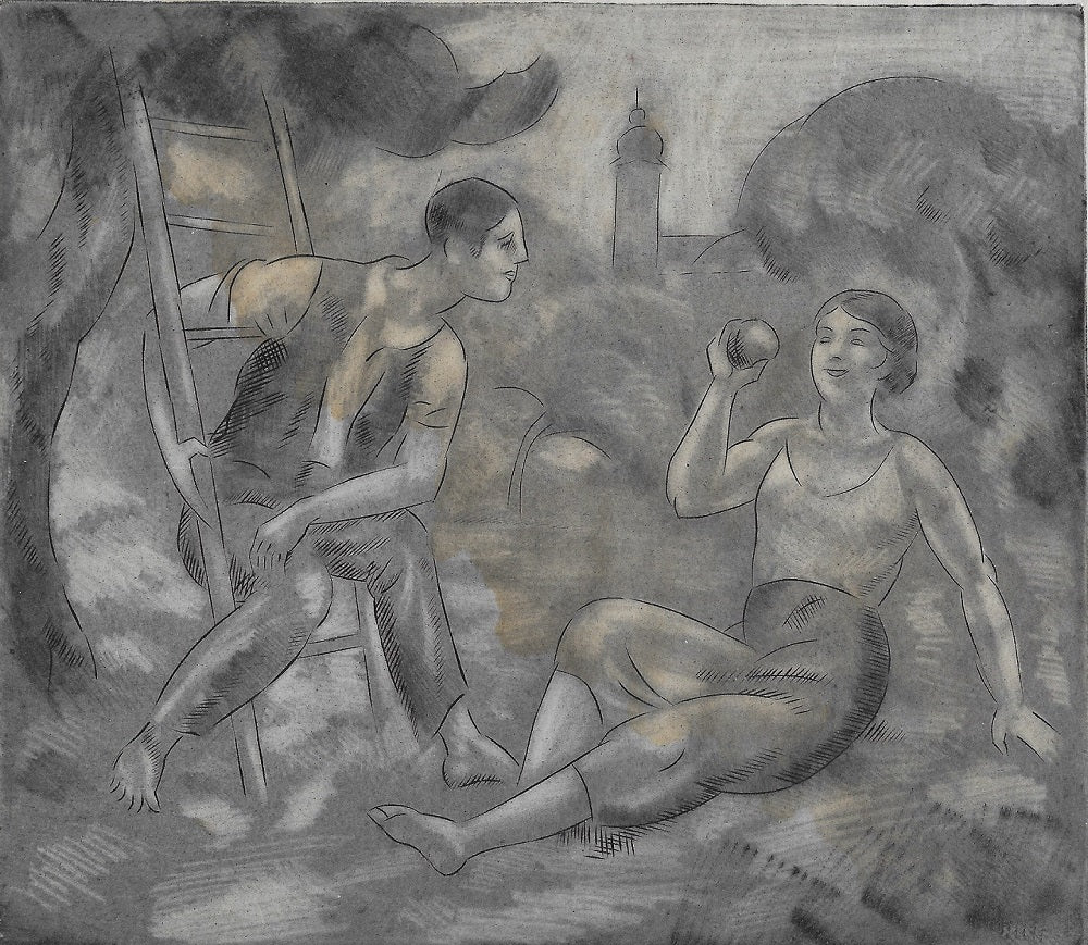 Estampe originale par Paul-Émile Colin (Lunéville, 1867 † Bourg-en-Bresse, 1949) sur papier sur Vélin. Au crayon, sous le CP, justifiée à g 8/25, signée à d, titre en bas au centre La Pomme. Un couple de paysan dans un verger, à gauche l’homme est assis sur une échelle adossée à un arbre, le bras droit accroché à un barreau, le gauche sur ses genoux ; il discute avec une femme à sa droite, en jupe, assise sur le sol croquant une pomme tenue dans sa main droite ; en arrière-plan derrière un bosquet un campanile. La feuille 155*294 mm, au CP 219*150 mm.