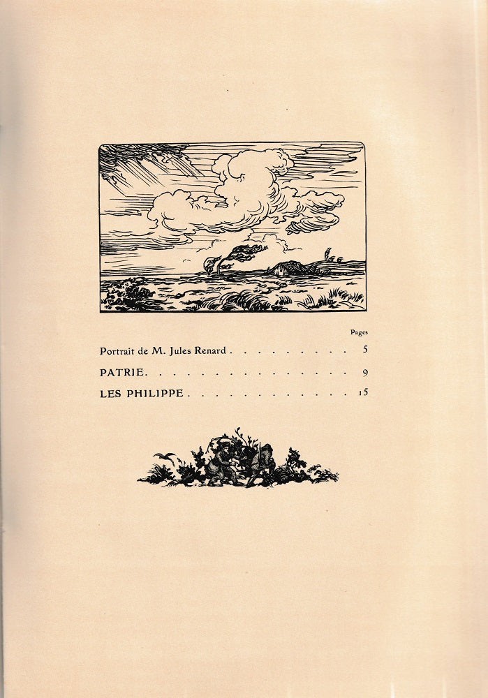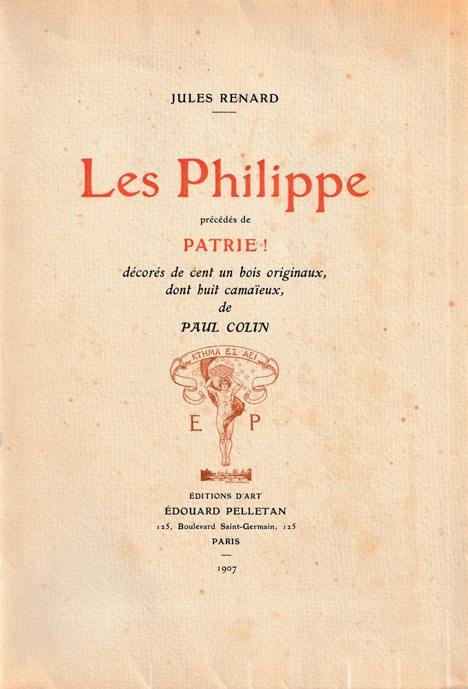 « Les Philippe précédés de Patrie ! » Textes du romancier d’origine nivernaise Jules Renard (Châlons-du-Maine (Mayenne), 22 février 1864 † Paris, 22 mai 1910) illustrés de 101 bois originaux, dont un portrait de Jules Renard HT et sept autres camaïeux HT, de Paul Colin (Lunéville (Meurthe-et-Moselle), 1867 † Bourg-en-Bresse (Ain), 1949). Grand in-8 broché sous couverture rempliée. Tirage à 1100 exemplaires. Paris, Éditions d'Art Édouard Pelletan, 1907, 136 p., avec huit pages spécimen en fin de texte. TBE.