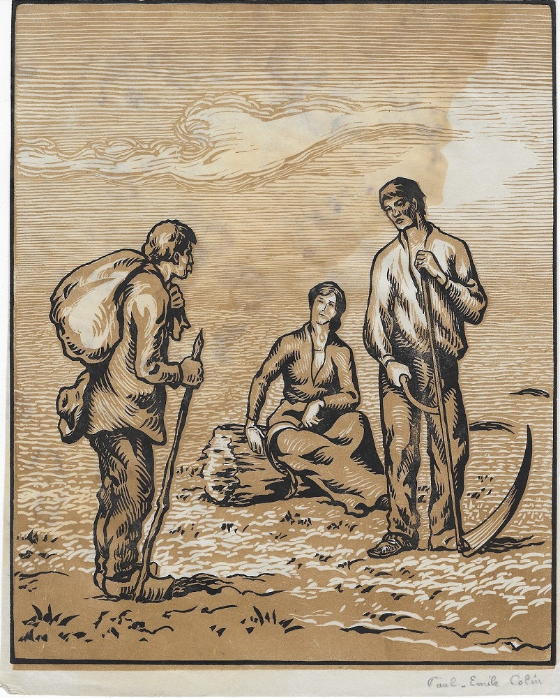 Estampe/Gravure originale sur bois en camaïeu de Paul-Émile Colin (Lunéville, 1867 † Bourg-en-Bresse, 1949). Épreuve d'état, marges coupées à la limite du CP. Sous le CP contresignée à droite ; annotée au verso dans le coin supérieur droit « 112054 / Prou ». La feuille 235*183 mm, la planche 222*183 mm. Sujet : à gauche un paysan ou un chemineau chaussé de sabots, s’appuie sur son bâton tenu à droite, un sac sur l’épaule gauche, s’adresse vers la droite à un couple de moissonneurs, au centre la femme le visage tourné vers le visiteur est assise sur une gerbe sur laquelle est posée sa main droite avec une faucille à la main gauche alors que l’homme, debout, à droite se tient sur sa faux devant lui. TBE. Provenance : Acquisition lors de la vente du 4 février1993 (Paris, Drouot-Richelieu, étude H.-P. Cheval et M.-F. Robert, expert cabinet Camard).