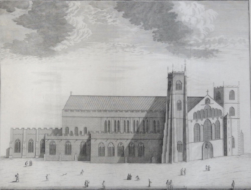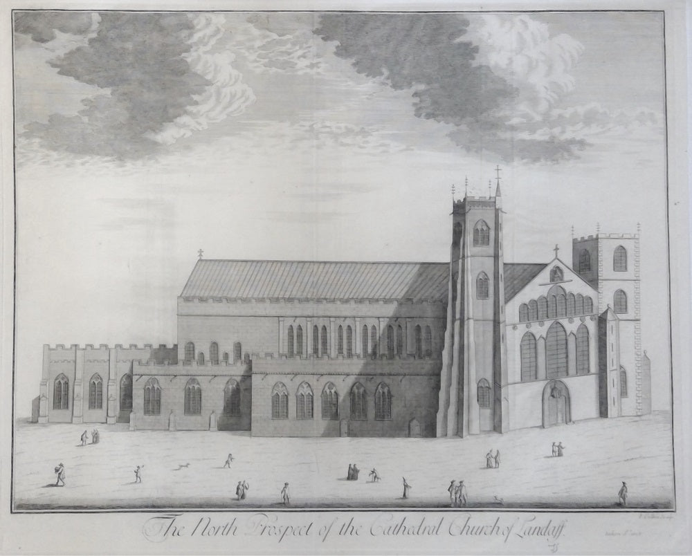 Gravure de James Collins (1675 † 1717). Représentation de la cathédrale (XIIe siècle) de cette ancienne paroisse du pays de Galles aujourd'hui faubourg de Cardiff. Vue d’architecture animée par une vingtaine de personnages dont deux religieux, un mendiant estropié, une courtisane, un apothicaire et deux chiens. Sous le TC à d I. Collins Sculp, en dessous The north prospect of the cathedral church of Landaff | taken N°1713. Pliures verticales habituelles. La feuille 477*590 mm, au CP 455*565 mm, au TC 416*545 mm.