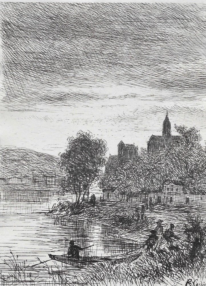 Planche originale par Raoul Cordier (Bayeux (Calvados), 1838 † 1905, expose au Salon de 1868 à 1890) pour PARIS A L'EAU-FORTE, Journal, d'actualité, de curiosité et de fantaisie illustré d'eaux-fortes tirées par Charles Delâtre, 2ème année, n°58 du 17 mai 1874. Paysage animée avec une barque et des pêcheurs au bord de la rivière, des promeneurs sur la berge, au loin les silhouettes d’un château et d’une église.. Signée à la pointe dans la planche en bd. Chine appliqué (133*99 mm) sur vélin 289*199 mm) gondolé suite collage de l’épreuve.