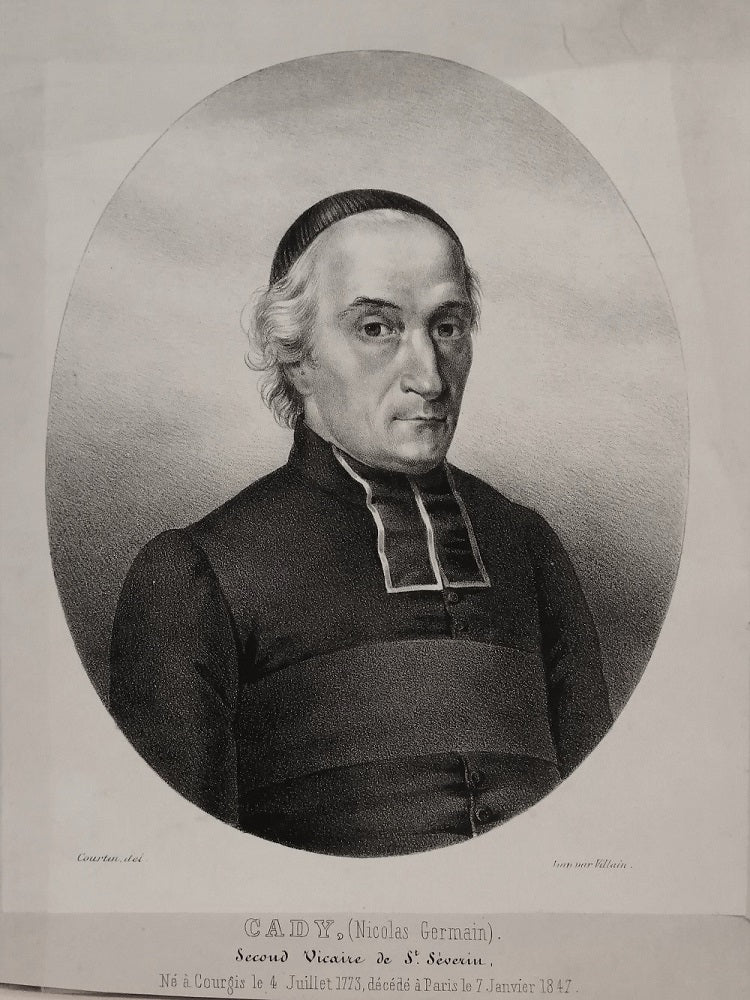 Estampe/Lithographie. Portrait, dessiné par Courtin et lithographié par Villain. Buste de 3/4 à droite dans un médaillon ovale. Sous le sujet, à gauche Courtin del, à droite Imp. Par Villain, en-dessous, au centre CADY, (Nicolas Germain) | Second Vicaire de St Severin | Né à Courgis le 4 juillet 1773, décédé à Paris le 7 janvier 1847. Notre épreuve : chine (223*183, le sujet 197*155) appliqué sur bristol. Bibl. : Bdf… du 24 avril 1847, n°383. Voir la Notice sur alcesteart.com.