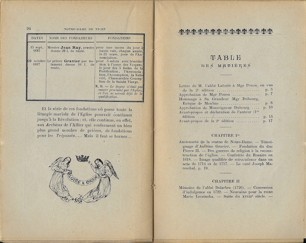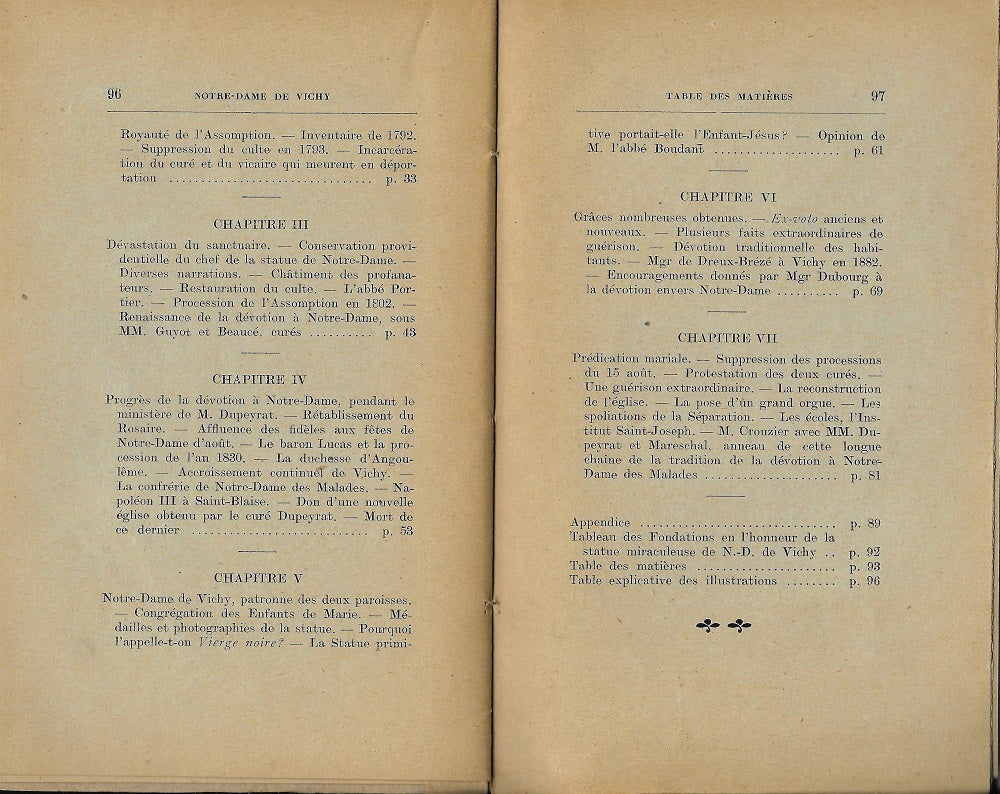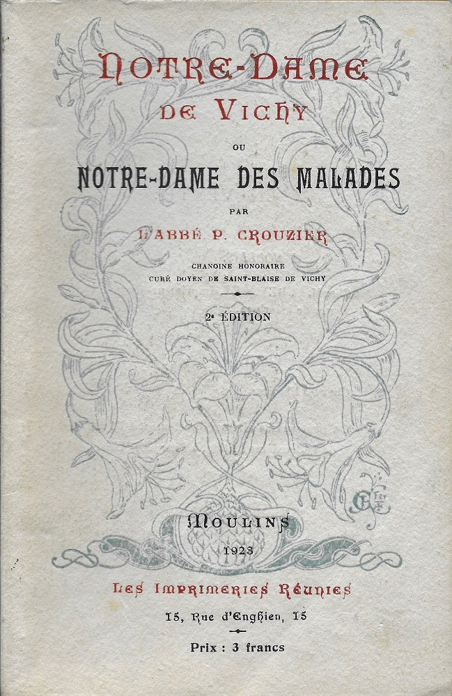 Seconde réédition de l'ouvrage de l'abbé Paul Crouzier, chanoine honoraire et curé doyen de Saint-Blaise de Vichy paru en 1897. Dessins HT par l'abbé J. Clément, phototypies. 100 p. Les Imprimeurs Réunies, Moulins, 1923.