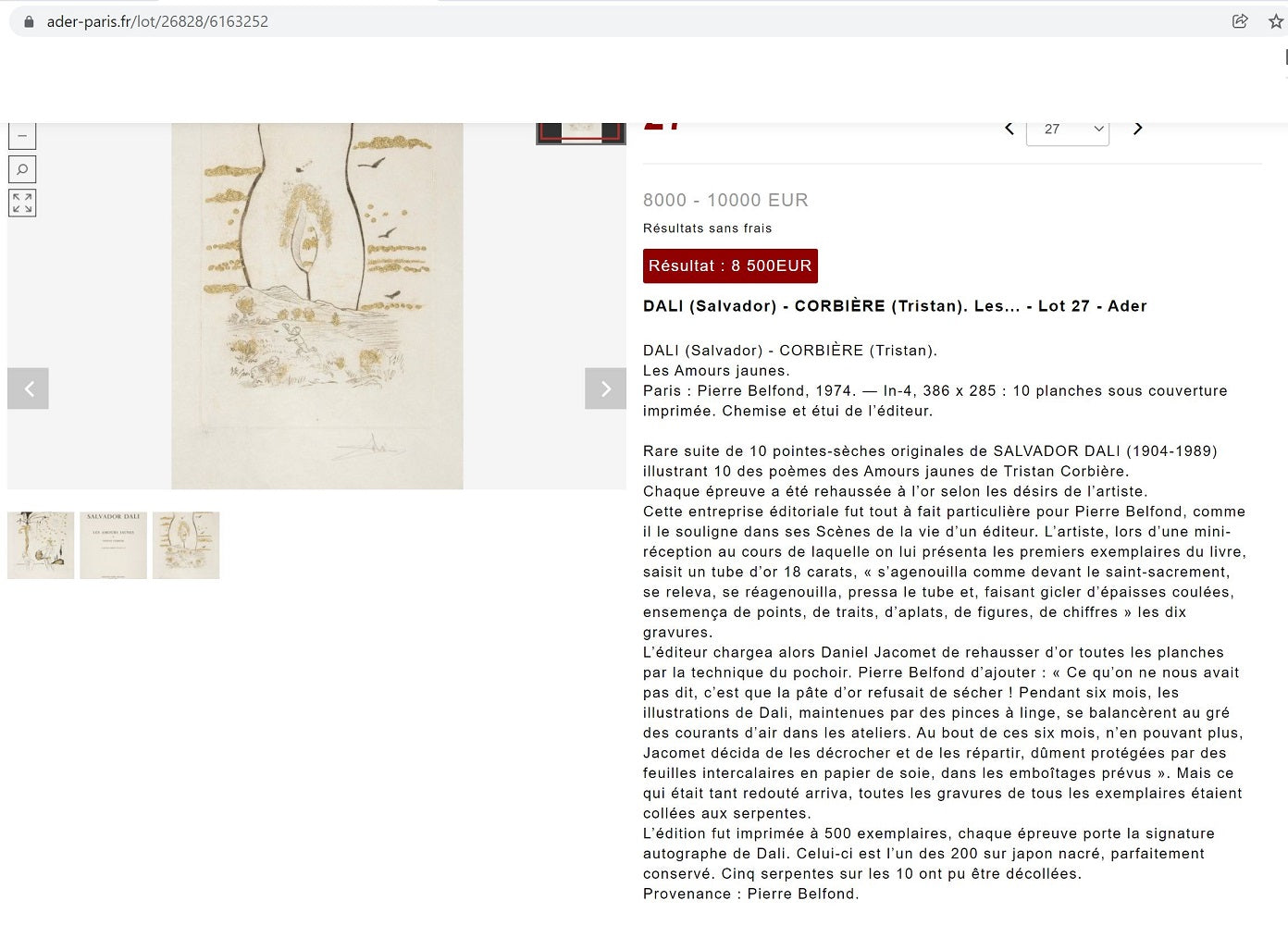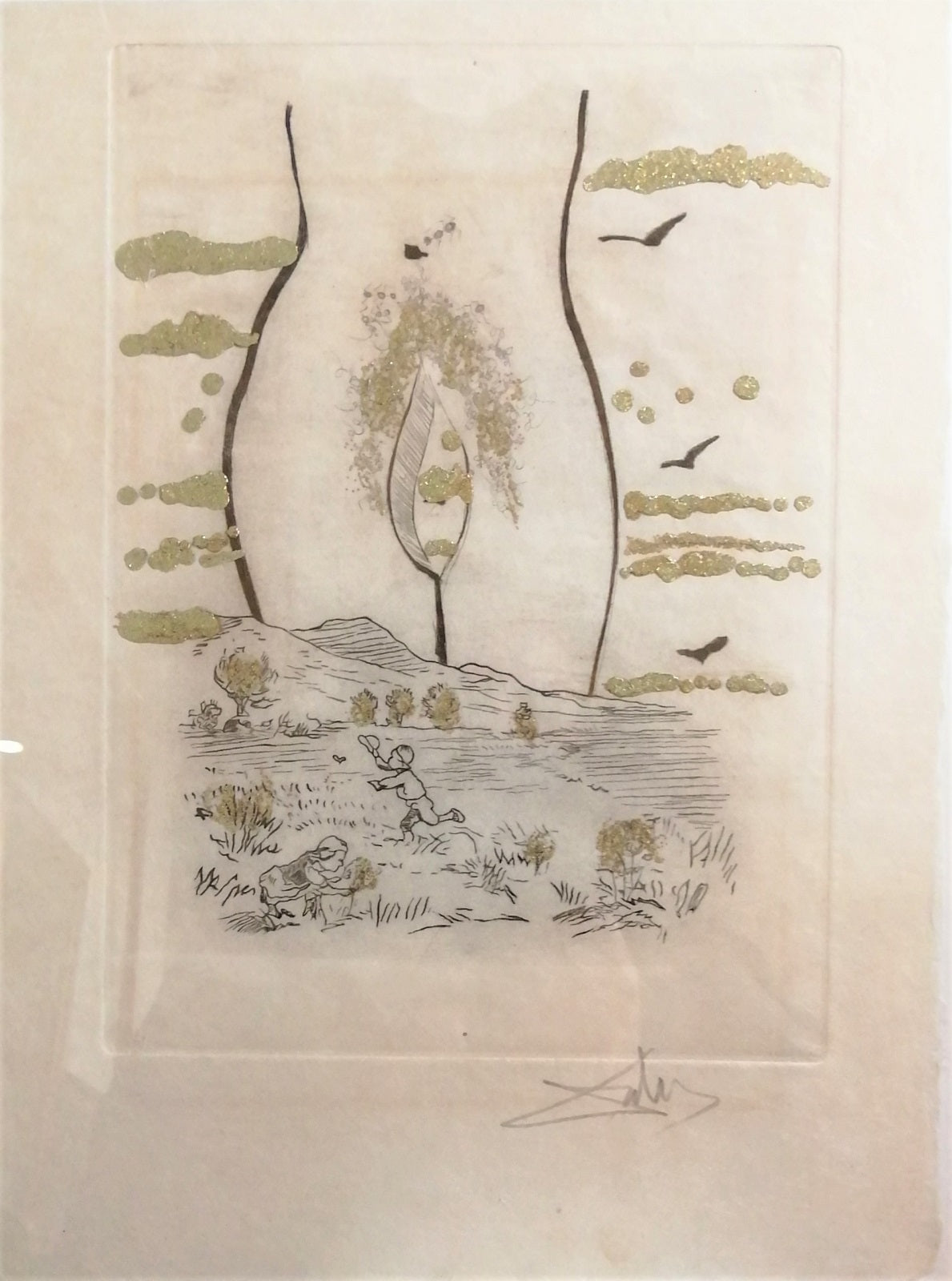 Une des10 gravures en noir de facture érotique par Salvador Dali (Figueras (Espagne), 11 mai 1904 † Figueras, 23 janvier 1989) rehaussées à l'or en relief par Daniel Jacomet d'après les titres des poèmes du recueil de Édouard-Joachim Corbière, dit Tristan Corbière (Morlaix, 18 juillet 1845 † Morlaix, 1er mars 1875) Les Amours Jaunes. (Paris, Belfond, collection Les Cahiers du Regard, 1974) tirées à 200 premiers exemplaires sur Japon Nacré signées par Salvador Dali. 380*285 mm. Joint certificat de Pierre Belfond. Suite à encadrement sans passe-partout l’épreuve s’est collé à la vitre au niveau des rehauts d’or en relief, sinon TBE (nota ; Pierre Belfond avoua que toutes les gravures de tous les exemplaires du tirage étaient collées aux serpentes suite au problème de séchage de la pâte d’or).