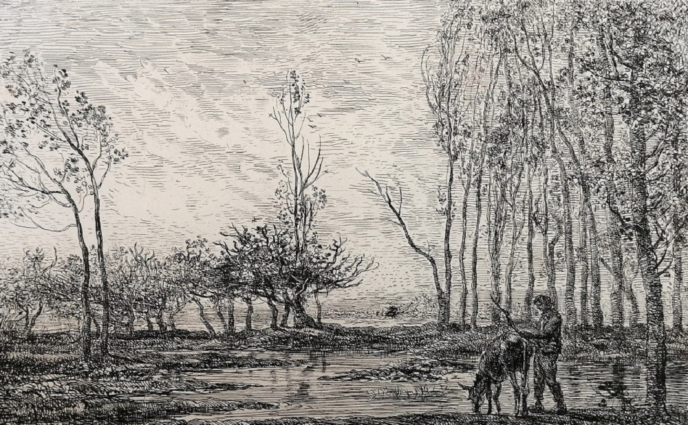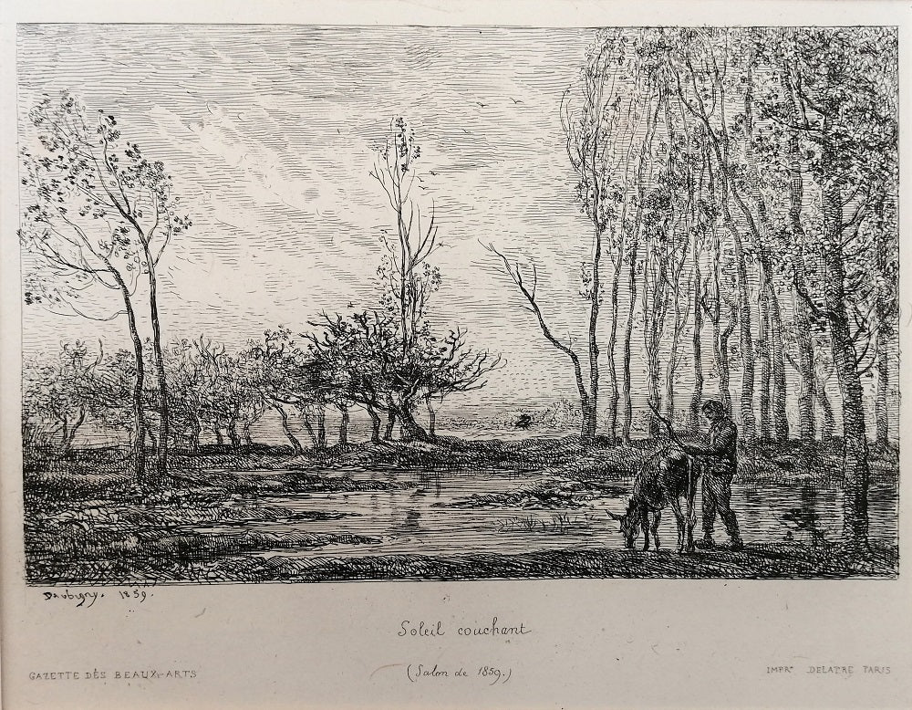 Estampe/Eau-forte par le peintre et graveur Charles-François Daubigny (Paris, 15 février 1817 † Paris, 19 février 1878). Gravée en 1859, exposée au Salon de 1859 n°768). Épreuve du 2ème État/2, Signée et datée, sur Chine appliqué contrecollée sur vélin. La feuille 193*272 mm, au TC 115*183 mm, au CP 157*221 mm Tirée par Delâtre pour La Gazette des Beaux-arts, 1er juin 1859, p.296. Bibl. : Catalogue Henriet ; L. D. 92 ; IFF1800, vol. 5, p. 411-424, n°46. Paysage rural, Scène de genre, Personnage, Paysan, Animaux