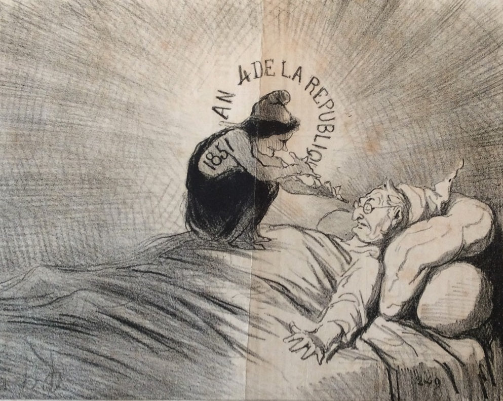 « An 4 de la République ». [Représentant Adolphe Thiers] Lithographie par Honoré Daumier (Marseille, 1808 † Valmondois, 1879). Planche du Charivari du 16 janvier 1851, série ACTUALITÉS. N° de planche 52. Bibl. : N° DR 2082 | N° LD 2082 | N° HD 2793. Dans la planche, monogrammée h.D. en bg ; N° de la pierre 249. Sous le sujet, en bg Chez Aubert & Cie, Pl. de la Bourse, 29 Paris ; en bdImp.de Me.Ve.Aubert, 5, rue de l'Abbaye, Paris. le sujet 251*200 mm.