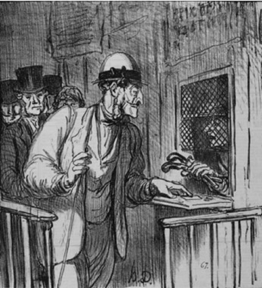 Chaque voyageur de première classe ayant droit en prenant son billet a une paire de pistolets. Lithographie par Honoré Daumier (Marseille, 1808 † Valmondois, 1879). Pl. n°5 pour la Série EN CHEMIN DE FER publiée dans Le Charivari du 1er septembre 1864 (2ème état). DR 3300 | LD 3300 | HD 1672. Monogrammée hD avec n° de la Pierre 67. Sous l’image à g Mon-Martinet, Paris, à d. Lith. Destouc.hes, Paris. Sujet 213*230 mm. Pliures d’usage, déchirure bd.