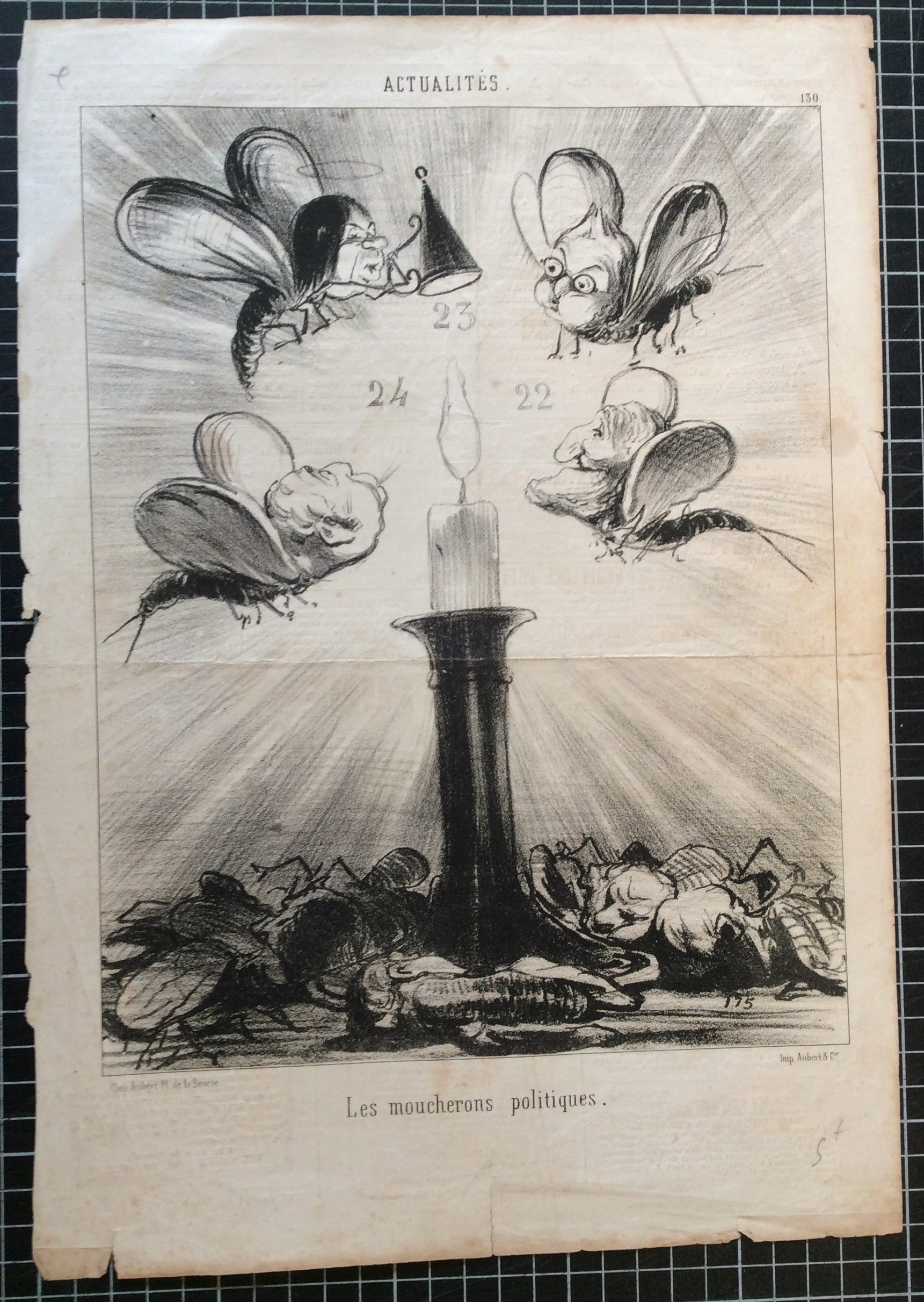 Estampe/Lithographie par Honoré Daumier (Marseille, 1808 † Valmondois, 1879). Planche du Charivari du 3 juin 1850, série ACTUALITÉS. N° de planche 130. 214*279 mm. Bibl. : N° DR 2012 | N° LD 2012 | N° HD 2854. Dans la planche, monogrammée h.D. en bg ; N° de la pierre 175. Sous le sujet, en bd Chez Aubert & Cie, Pl. de la Bourse, Imp. d'Aubert & Cie. Déchirures sur les bords sans atteinte au sujet.
