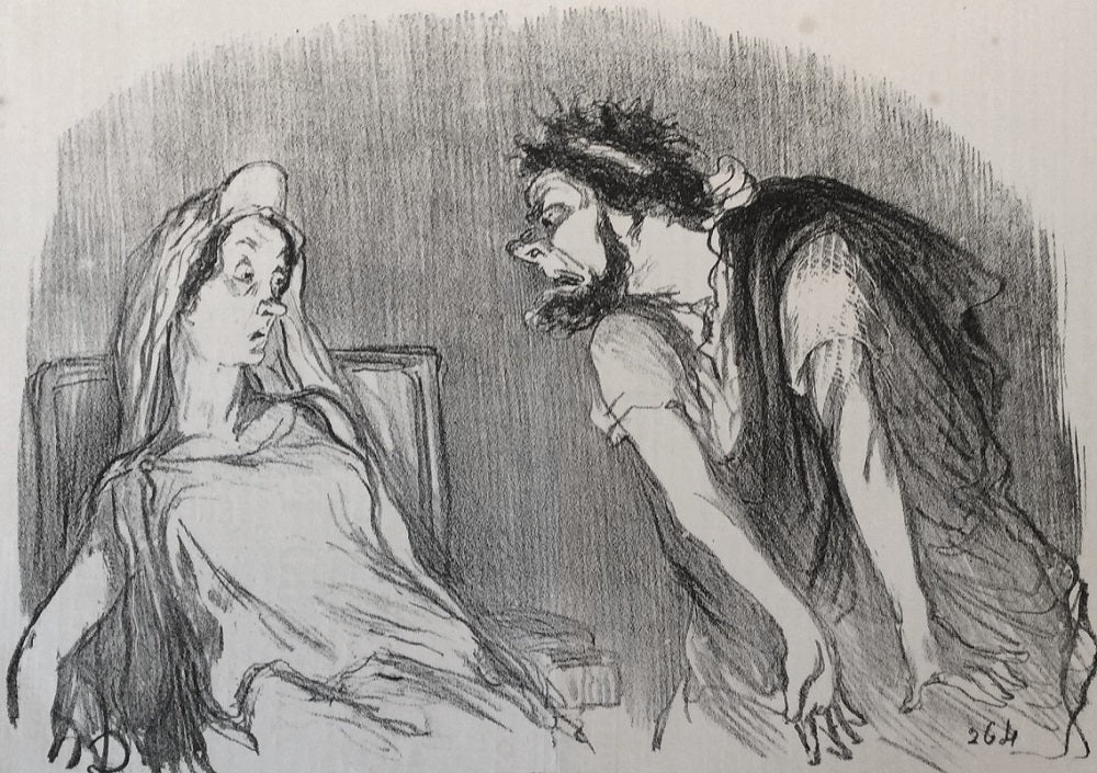 « OEDIPE. | - Moi-même en le perçant, je sentis dans mon âme, | Tout vainqueur que j'étais.... vous frémissez madame ! ». Lithographie par Honoré Daumier (Marseille, 1808 † Valmondois, 1879). Planche du Charivari du 15 juillet 1851 série PHYSIONOMIES TRAGIQUES. N° de planche 10. Bibl. : N° DR 2184 | N° LD 2184 | N° HD 2373. Dans la planche, monogrammée h.D. ; sous le sujet, en bg Chez Aubert & Cie. Pl.de la Bourse, 29 Paris ; en bd Imp.de Me. Ve. Aubert, 5, rue de l'Abbaye, Paris. N° de la pierre 264. Pliure verticale centrale. Légères épidermures dans les marges. le sujet 283*207 mm.