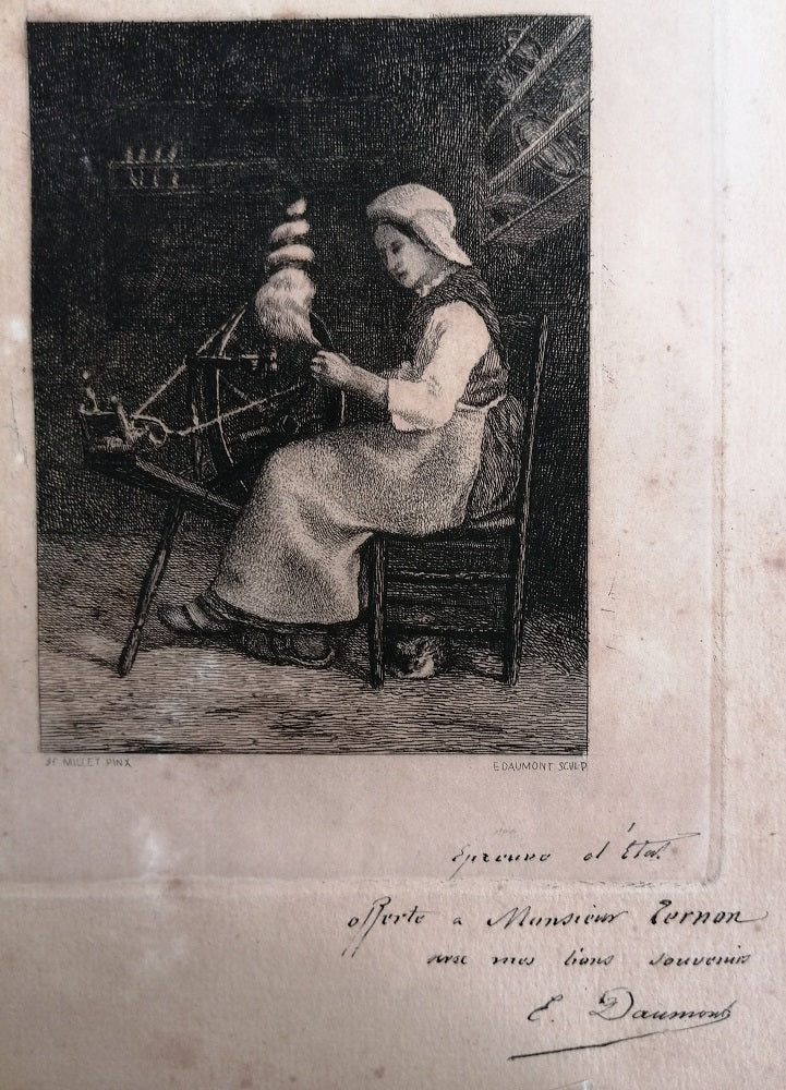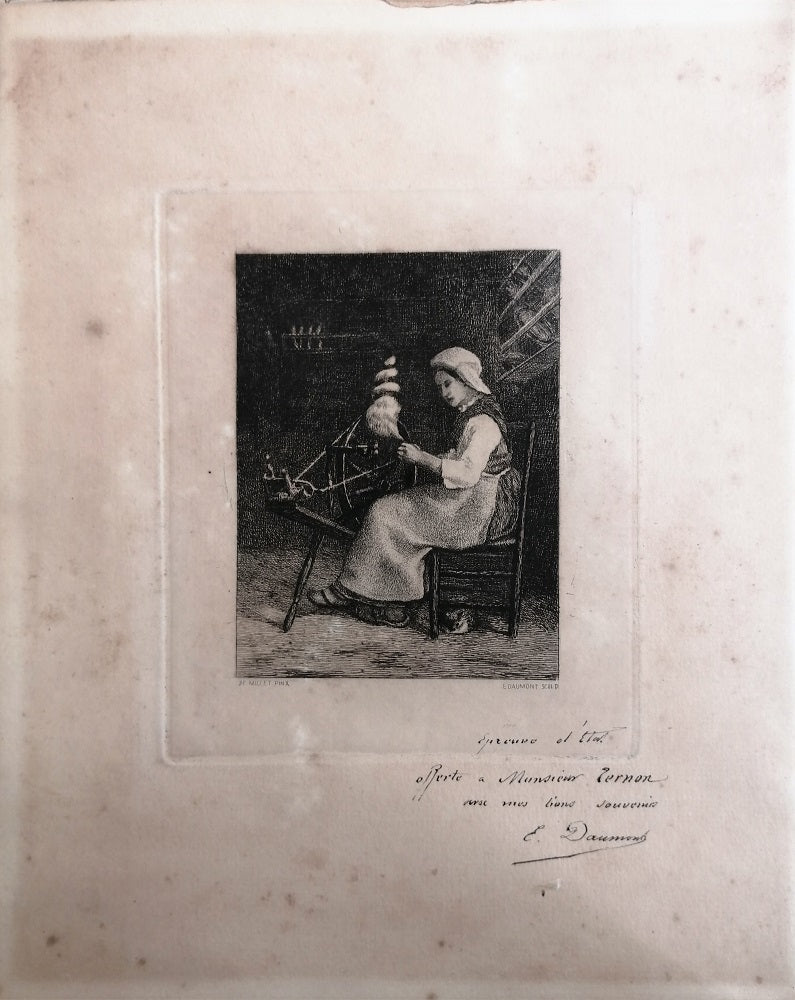 Eau-forte par Émile-Florentin Daumont (Montereau-Fault-Yonne (Seine-et-Marne), 20 février 1834 † Melun, 25 juin 1921). Belle épreuve malgré insolation annotée à l’encre en bd. Épreuve d’ État | offerte à Monsieur Ternon | avec mes bons souvenirs | E. Daumont. Sous le TC à g J. F. MILLET PINX, à d E. DAUMONT SCULP. Daumont a envoyé au Salon des Artistes de 1890 Une fileuse d’après: J.-F. Millet (n°4952), et en 1898 Une paysanne en train de filer, d’après Millet (n°4608), La feuille 240*197 mm, au CP 137*117 mm, au TC 103*78 mm.