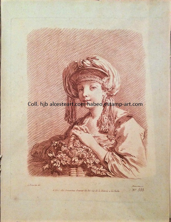 En buste, de trois quarts à gauche, coiffée d’un turban, les mains croisées sur l’anse d’un panier de fleurs. ». Manière crayon à la sanguine de Gilles Demarteau (Liège, 19 janvier 1722 † 1776) d’après Jean-Baptiste Le Prince (Metz, 17 septembre 1734 † 30 septembre 1781) : La feuille 349*262 mm, au CP 280*230 mm ; dans la planche en bas à gauche Le Prince del., à droite Demarteau sc., en dessous au centre A Paris chez Demarteau Graveur du Roirue de la Pelterie a la Cloche, à droite N°388. Notre épreuve : BE. Bibl. : IFF XVIII, p. 444, n°388.