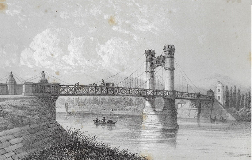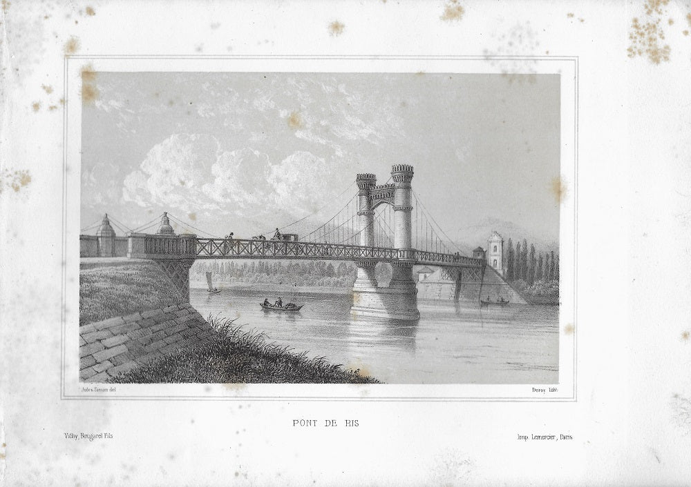 Estampe dessinée par Jules Simon (1816 † 13 novembre 1868), lithographie couleur par Isidore Deroy (Paris, 1797 † 1886), tirée par Lemercier pour Bougarel à Vichy. Paysage animé d’un pont situé sur l’Allier entre Vichy et Thiers. Sur lequel passe un fiacre alors que deux barques flottent sur la rivière. Épidermures. Dim. : 185*265 mm, au TC 115*177 mm.